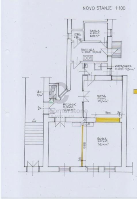 Prostor je godinama bio u funkciji ureda i postojeće uređenje u potpunosti je prilagođeno poslovnoj namjeni. Sastoji se od velike glavne prostorije površine 56 m2 povezane manjom prostorijom, prostranog ulaznog hodnika koji može služiti kao recepcijski prostor, kupaonice, odvojenog toaleta, kuhinje, manje sobe te spremišta unutar prostora. Dodatno mu pripada i spremište u podrumu.