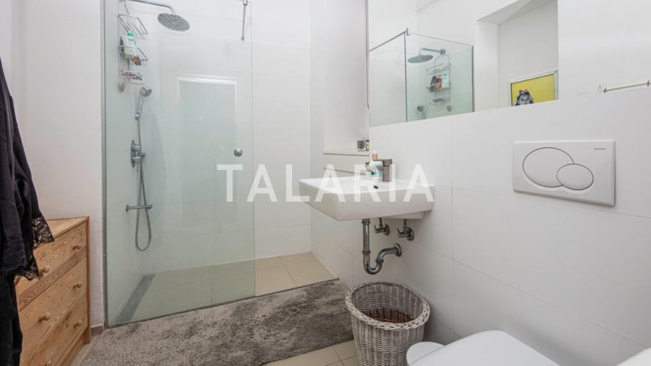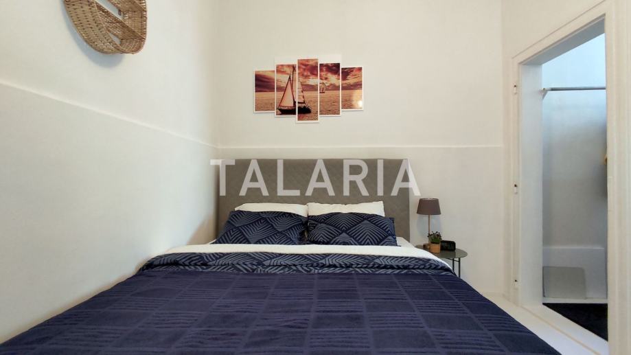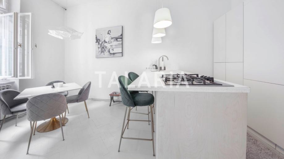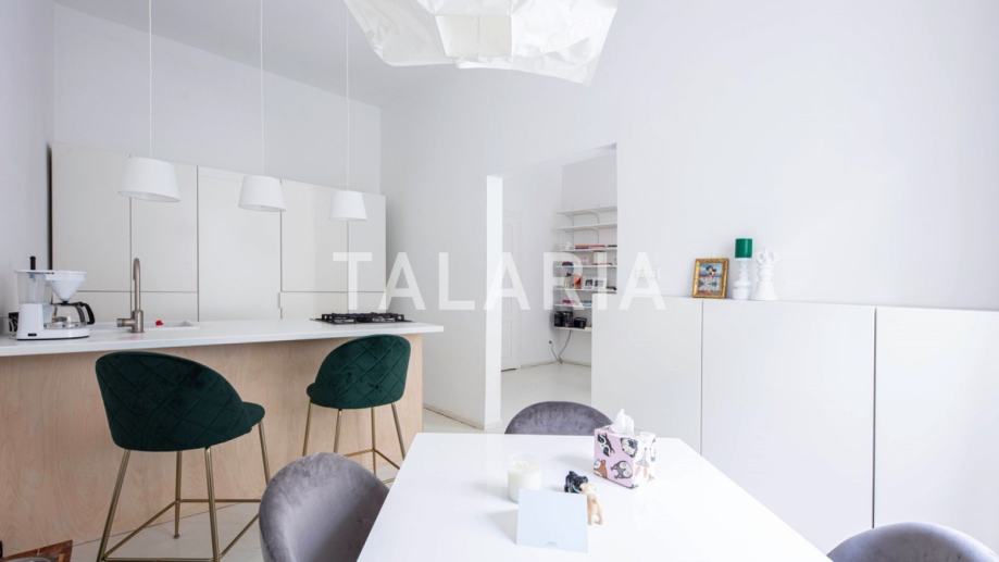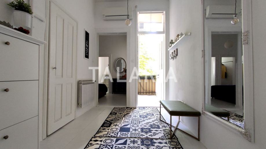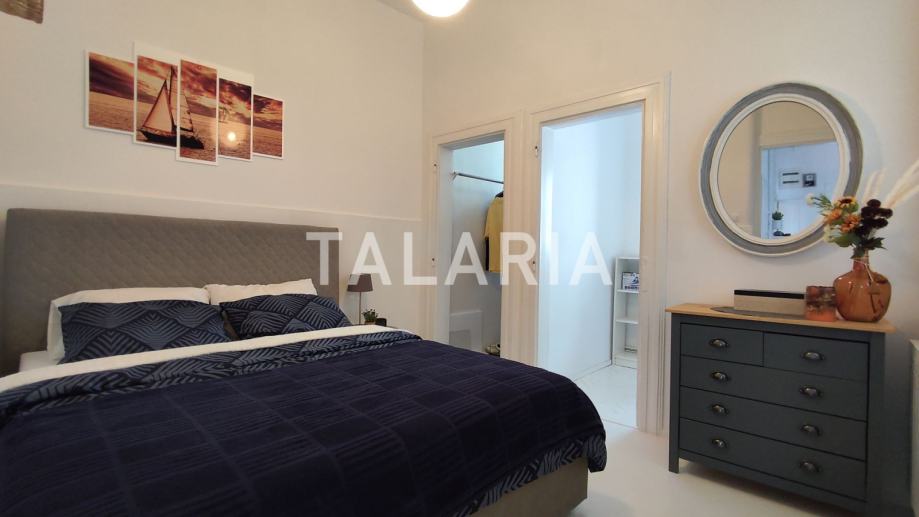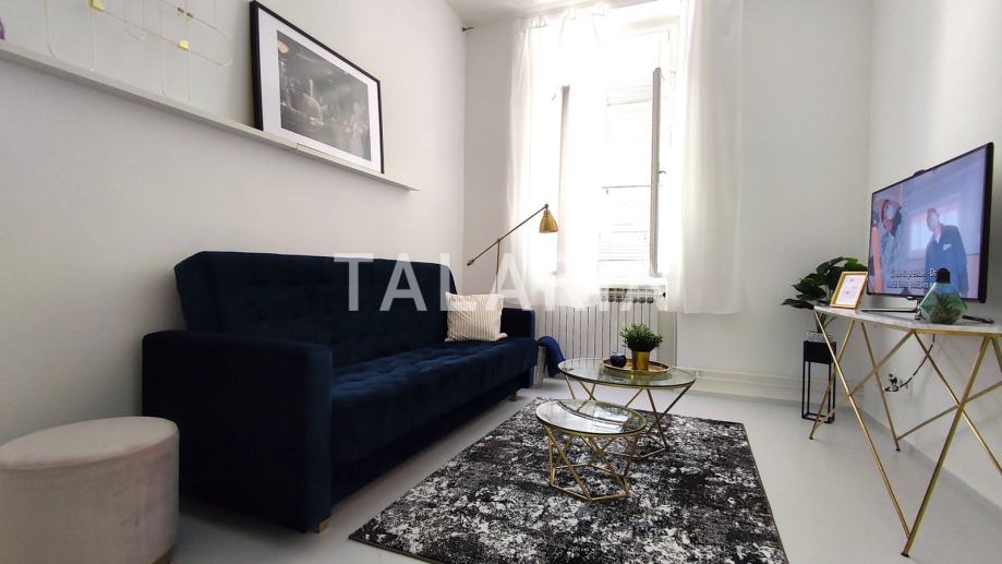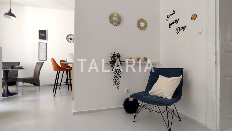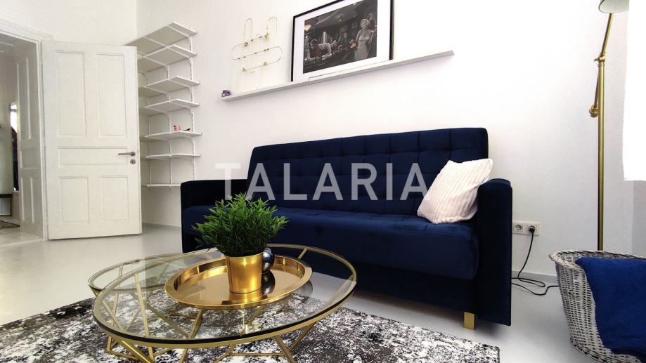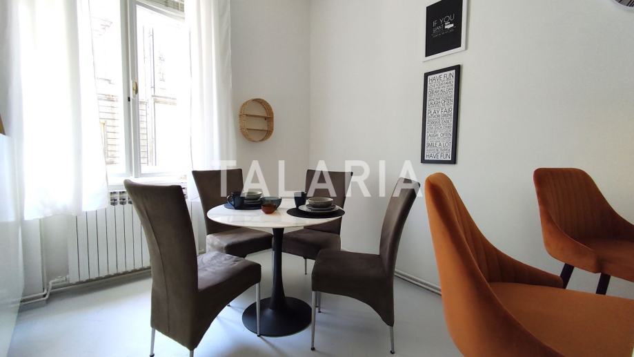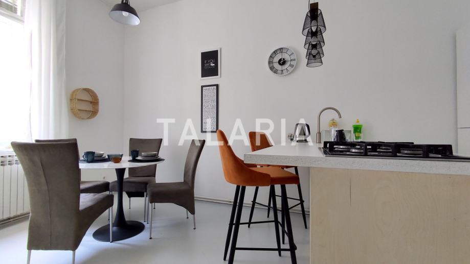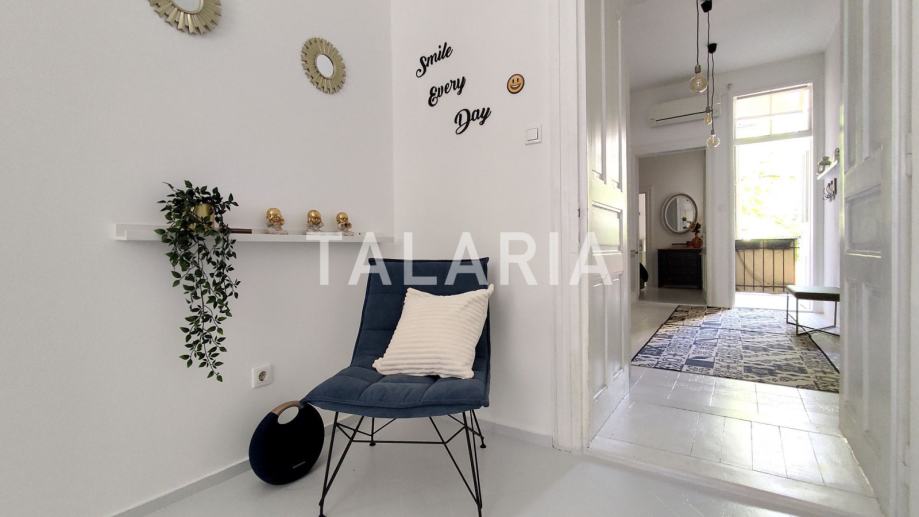 Ovaj sladak, moderan stan nalazi se u centru grada u zgradi s obnovljenom fasadom, na visokom prizemlju. Sastoji se od komotnog ulaznog hodnika s izlazom na balkon koji gleda na dvorišnu stranu, dnevnog boravka s blagovaonom i kuhinjom, spavaće soba s 2 garderobe svaka s prozorom, te kupaone s walk-in tušem. U stanu je sačuvan izvorni parket koji je obnovljen. Minimalistički uređen za ugodan boravak. Pripada mu šupa u dvorištu. Zgrada je kompletno obnovljena 2021. godine kada su rekonstruirani dimnjaci i krov; a 2022. godine je postavljena nova fasada, uređeno je stubište i zajednički prostori.
