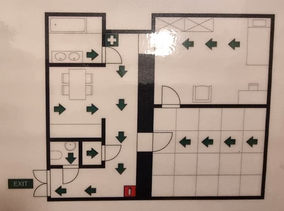 Stan se sastoji od ulaznog hodnika, 2 spavaće sobe, kuhinje i blagovaonice, kupaonice, gostinskog toaleta i ostave.