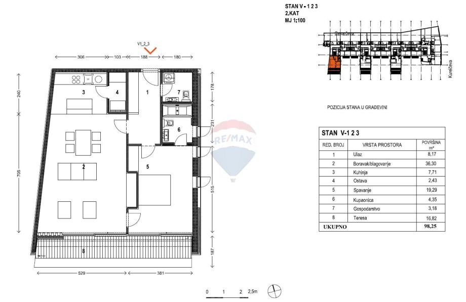 Stan se nalazi na drugoj etaži, a sastoji se od ulaznog prostora, dnevnog boravka s blagovaonom, jedne spavaće sobe, kuhinje, ostave, kupaonice s walk in tušom i prostorije za gospodarstvo s dodatnim sanitarnim čvorom, ukupne korisne površine 81,43 m2 s terasom ukupne podne površine 16,82 m2, što sveukupno iznosi 98,25 m2. Ovaj pametni stan ima mogućnost kompletnog upravljanja podnim grijanjem, kamerama, klimom putem iPad uređaja, što budućem vlasniku značajno olakšava kontrolu svih funkcija. Nekretnina je u potpunosti orijentirana prema tihom dvorištu što jamči mir i odmak od gradske vreve i buke. Stan je moguće urediti prema vlastitim afinitetima i pretvoriti u ugodnu oazu u strogom centru grada bilo za stanovanje ili investiciju.