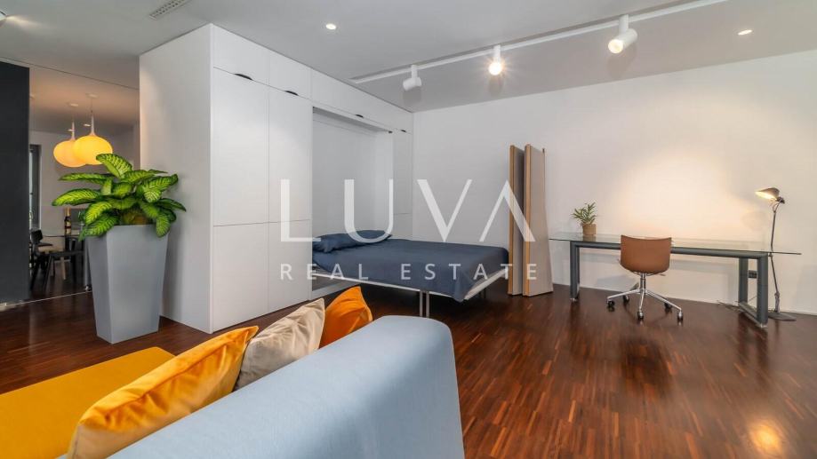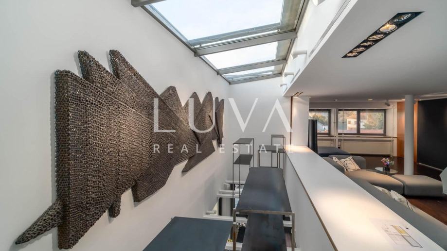Interijer je osmišljen u sofisticiranom open space stilu s izraženim umjetničkim karakterom. Na donjoj etaži nalazi se prostrani dnevni boravak povezan s radnim kutkom, moderno opremljena kuhinja, kupaonica i natkrivena terasa. Gornja etaža nudi veliku spavaću sobu, prostranu kupaonicu i dodatni multifunkcionalni prostor koji se može prilagoditi potrebama budućeg vlasnika. Svaki detalj u prostoru promišljeno je dizajniran kako bi stan zadržao originalnost, ali i udobnost.