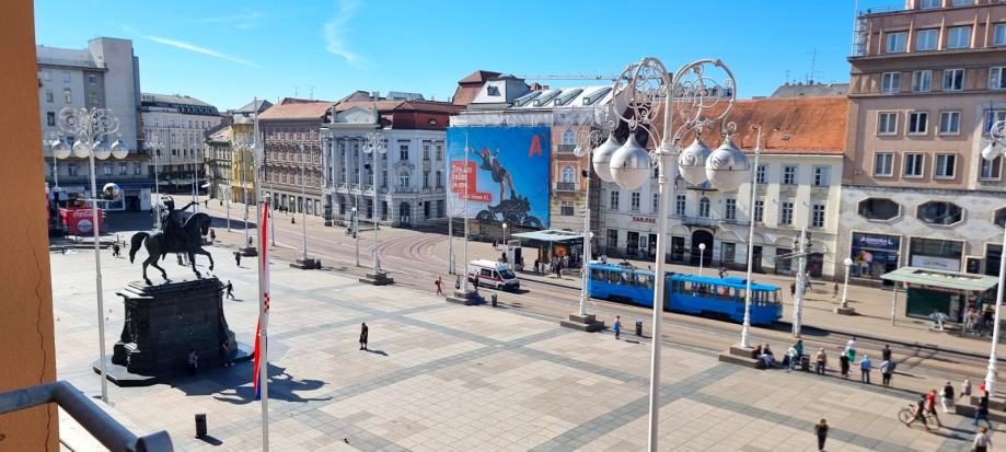 Na prodaju je ovaj otmjen i prostran stan od 230m2 sa dva prekrasna balkona s kojih se pruža panoramski pogled prema glavnom gradskom Trgu bana Josipa Jelačića u srcu grada Zagreba.