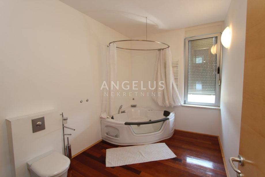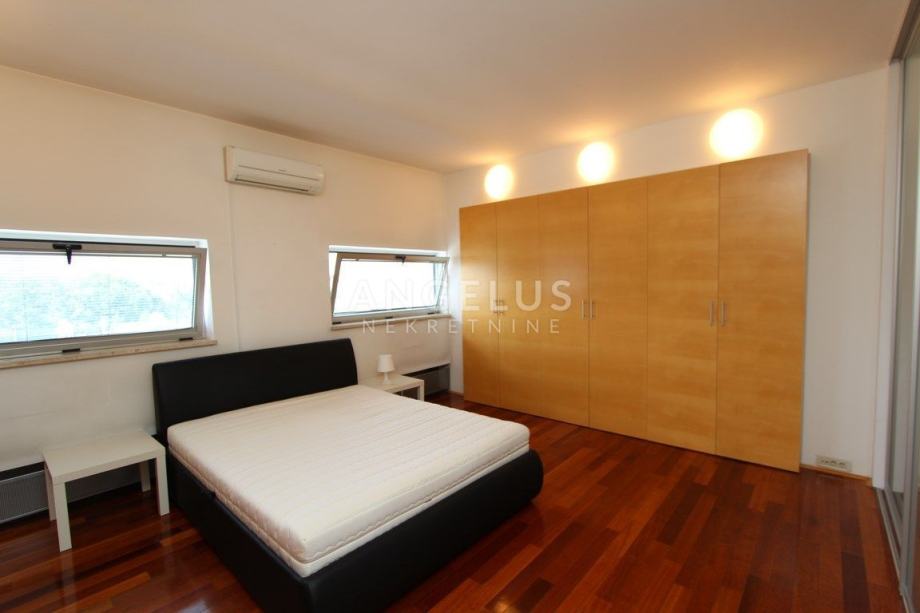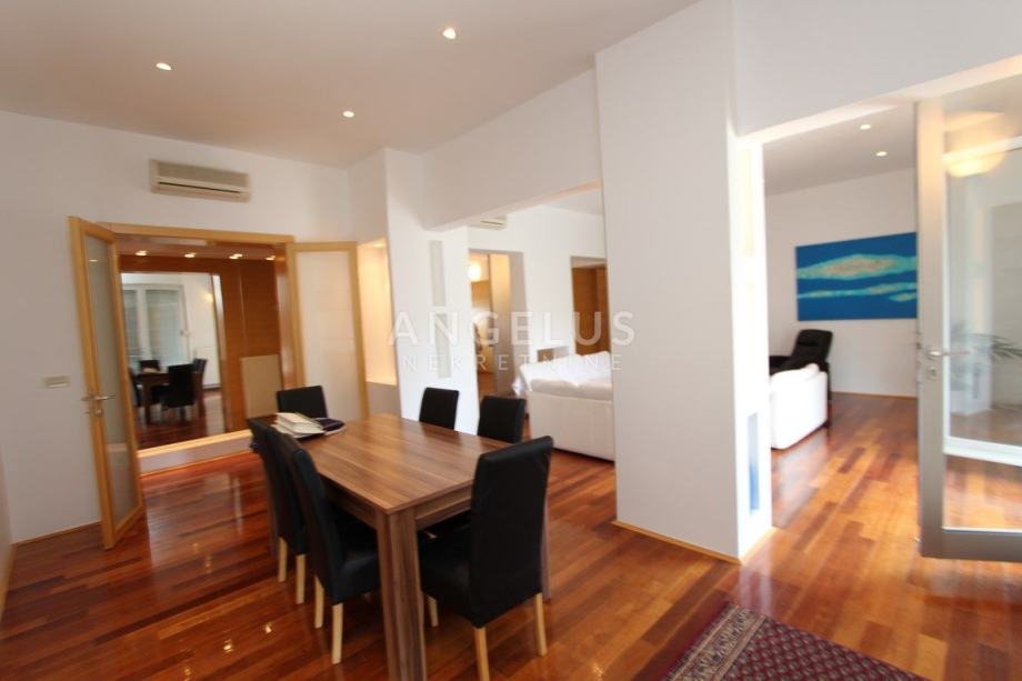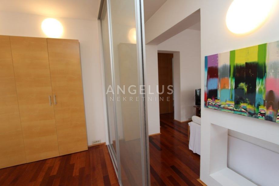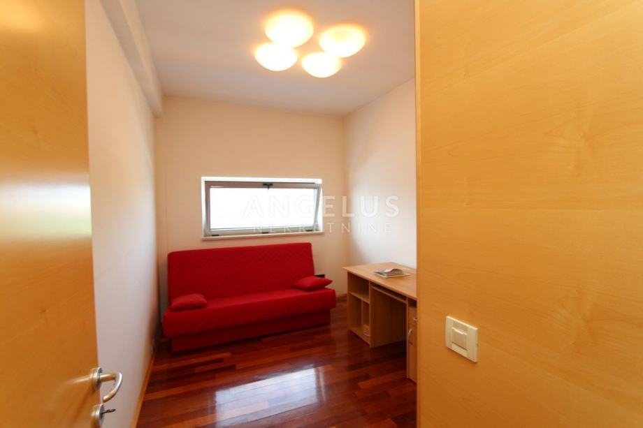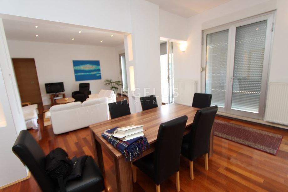 Nalazi se na 5.katu zgrade sa liftom (lift vozi do 4.kata), a sastoji se od ulaznog hodnika, dnevnog boravka povezanog s kuhinjom i blagovaonicom, 2 spavaće sobe, kupaonice, ostave i velike terase. Namješten je.