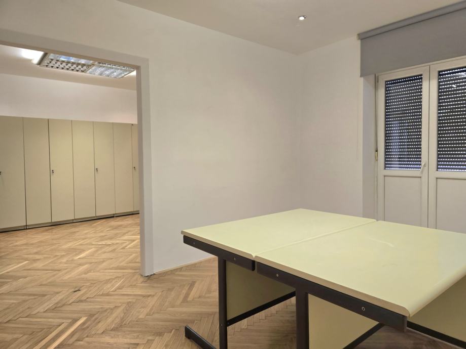 Iznajmljuje se stan pogodan za uredsku i sličnu djelatnost. Stan se sastoji od ulaznog hodnika, jedne sobe s balkonom na dvorišnu stranu, dvije velike sobe s balkonom na uličnu strane, centralne prostorije koja ima dnevno svjetlo i recepciju, te kuhinje i toaleta. Zakup je isključivo dugoročno.