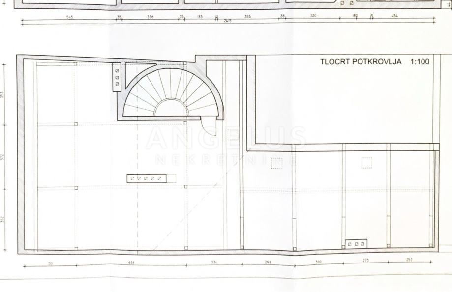 Na zadnjoj etaži je prostrani neuređeni tavan. Ukupna kvadratura je 445m2, ali neto obračunskog prostora. Brutto kvadratura je puno veća. Etažiranje je u postupku.