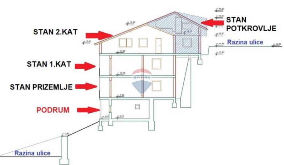 Kuća se prostire na čak 5 etaža od kojih su 4 zasebna stana. Sve stanove povezuje zajedničko stubište.