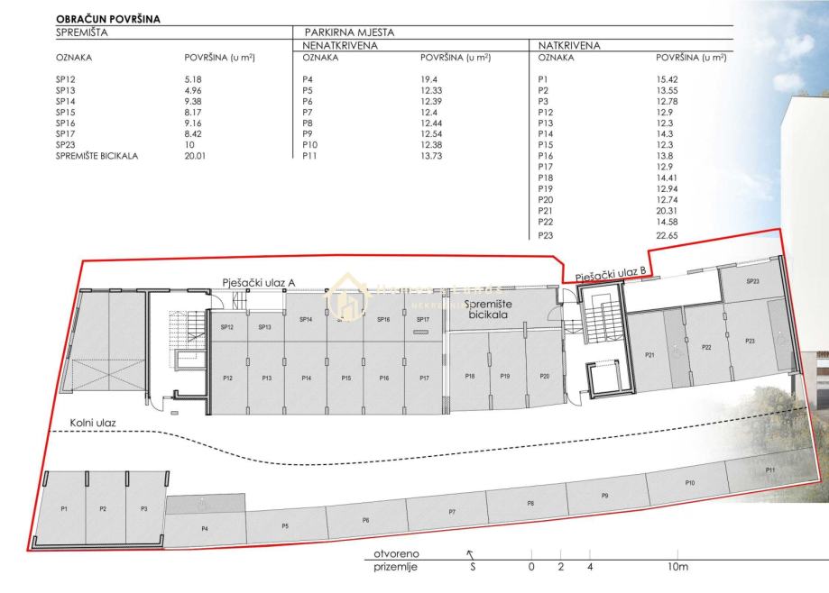 Natkriveno parkirno mjesto (P1 - P3): 1650 €/m²Nenatkriveno parkirno mjesto (P4 - P11): 1350 €/m²Natkriveno parkirno mjesto sa spremištem (P12 - P17, P23): 1650 €/m²Natkriveno parkirno mjesto (P18 - P22): 1600 €/m²