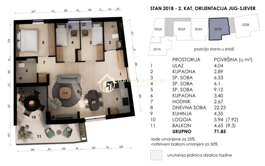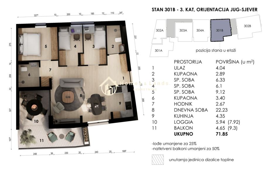 ČETVERSOBAN STAN stan površine 71,85 m2 (201B I 301B 3 kat) na 2. katu B zgrade, orijentiran istok-zapad sastoji se od ulaznog hodnika, kuhinje s blagovaonicom, dnevnog boravka, tri spavaće sobe, dvije kupaonice i prostranog balkona.
