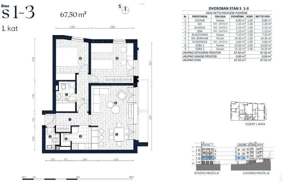 Zagreb, Črnomerec, trosoban stan na prvom katu u sklopu luksuzne novogradnje od 11 stanova.Stan S1-3 se na nalazi na prvom katu te se sastoji od ulaznog hodnika, dnevnog boravka, kuhinje, blagovaonice, kupaonice, zasebnog wc-a, spremišta te dvije spavaće sobe ukupno zatvorene površine 67,50...
