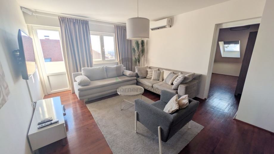 Zagreb, Črnomerec - stan od 78 m2 tlocrtne površine (s koeficijentima 70 m2). Nalazi se na trećem katu/potkrovlju stambene zgrade od tri kata. Sastoji se od ulaznog prostora, dnevnog boravka s blagovaonicom i velikim balkonom, kuhinje, kupaonice s tuš kabinom i toaletom te tri spavaće sobe. Kompletno je uređen prije 3 godine (od instalacija do novog namještaja i aparata) i kao takav je na prodaju. Idealan obiteljski stan, svijetao, ugodan i na dobroj lokaciji. Orijentiran je trostrano, na istok, zapad i jug. Grijanje je centralno etažno plinsko, stan je klimatiziran, ima prootuprovalna vrata, a u kupaonici je podno grijanje.
