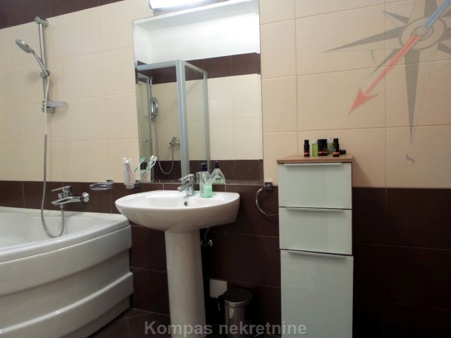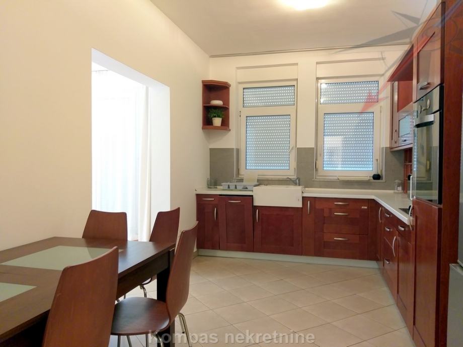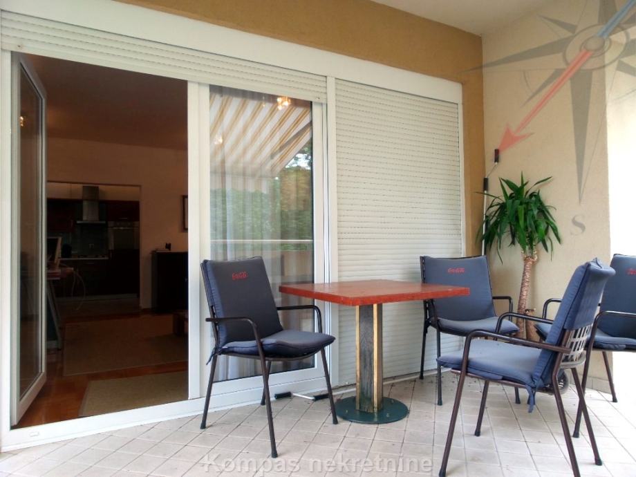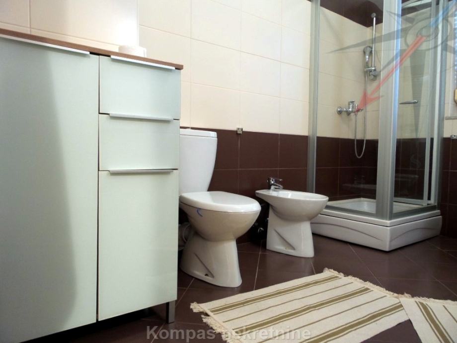 Furnished three-room apartment (86 m2) on the first floor of a newer residential building, Trsje. It consists of a hallway, kitchen, living room, two bedrooms, two bathrooms and a partially covered terrace ( 26 m2 ) with a view of the forest. It has an intercom, security door, high-speed internet, air conditioning, gas central heating. By agreement, it can also be rented without furniture. It has a storage room in the basement and two parking spaces in front of the building. Located in a quiet street, near the bus line.