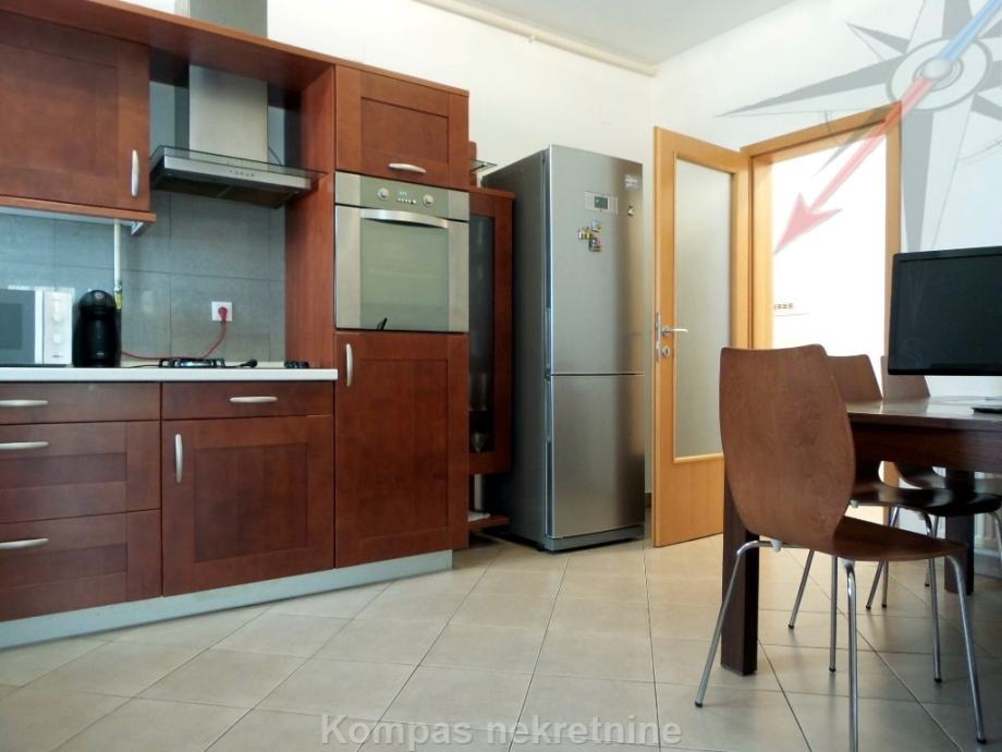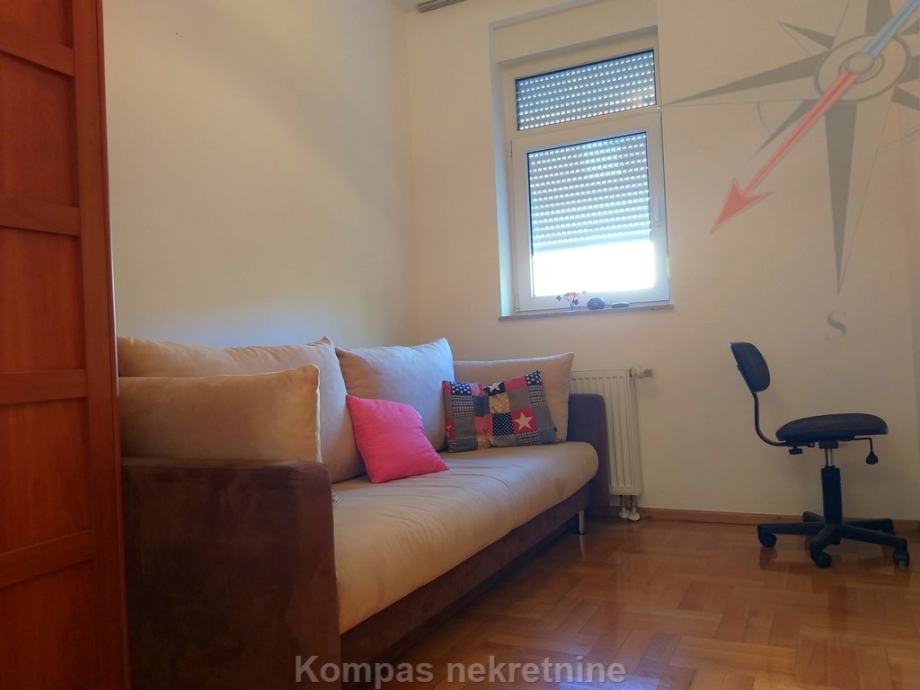 Namješten trosoban stan ( 86 m2 ) na prvom katu novije stambene zgrade, Trsje. Sastoji se od hodnika, kuhinje, dnevnog boravka, dvije spavaće sobe, dvije kupaonice i djelomično natkrivene terase ( 26 m2 )s pogledom na šumu. Ima portafon, protuprovalna vrata, mogućnost brzog interneta, klima uređaj, plinsko centralno grijanje. Prema dogovoru, može se unajmiti i bez namještaja. Pripada mu spremište u podrumu i dva parkirna mjesta ispred zgrade. Nalazi se u mirnoj ulici, u blizini autobusne linije.