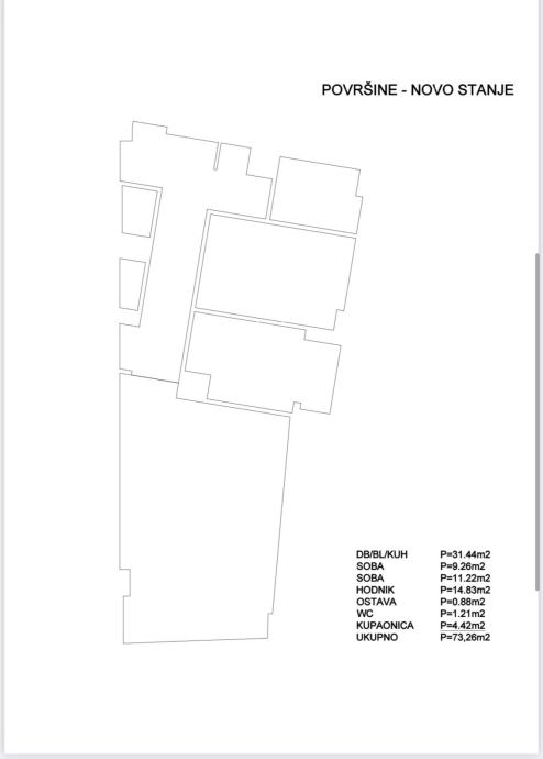 Stan je ukupne površine 73,26 m2, a sastoji se od hodnika, open space dnevnog boravka, kuhinje i blagovaonice, 2 spavaće sobe, kupaonice, wc-a i ostave.