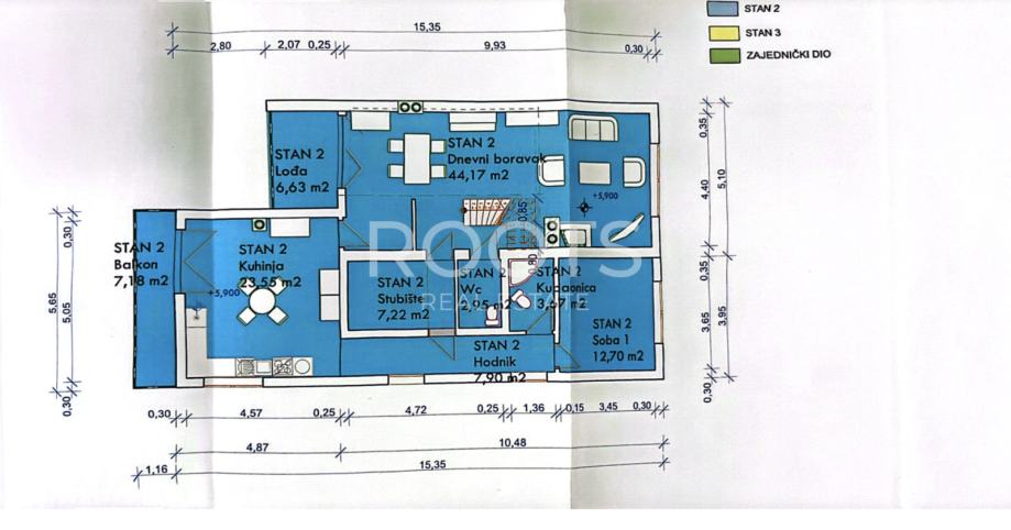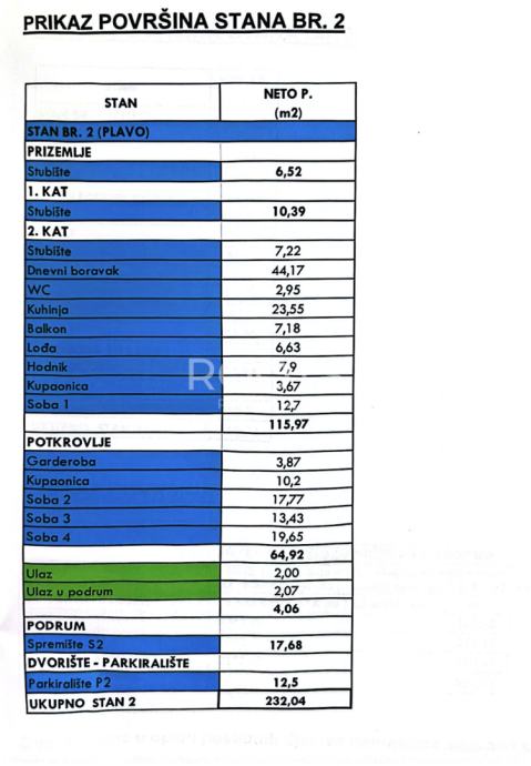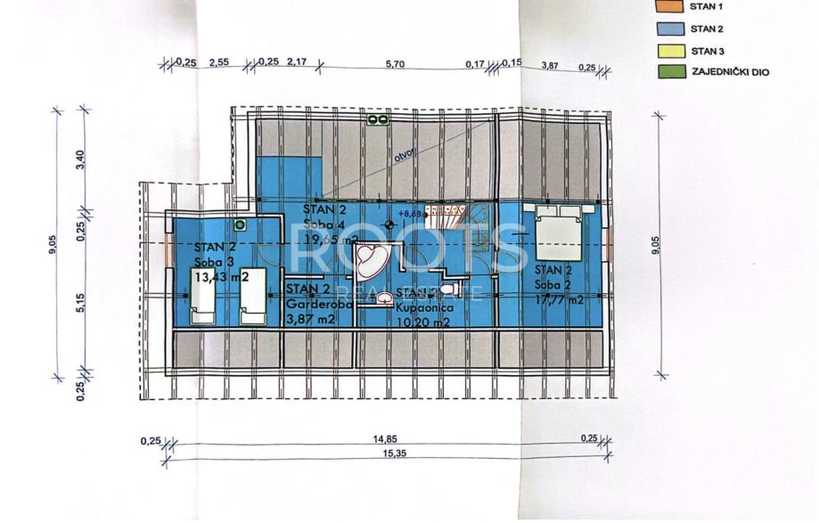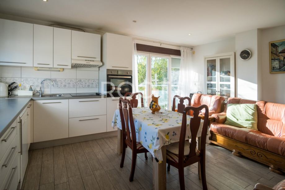 Stan je zapadne orijentacije, osunčan, održavan i spreman za useljenje. Pripada mu spremište od 18 m2 i vanjsko parking mjesto. Zajedno sa pripadcima ima cca 203 m2. Sastoji od dvije etaže i u naravi dvije zasebne stambene jedinice od kojih je jedan dvosoban a jedan dvoetažan četverosoban. Lako ih je spojiti u jednu stambenu cjelinu i dobiti veliki obiteljski stan.