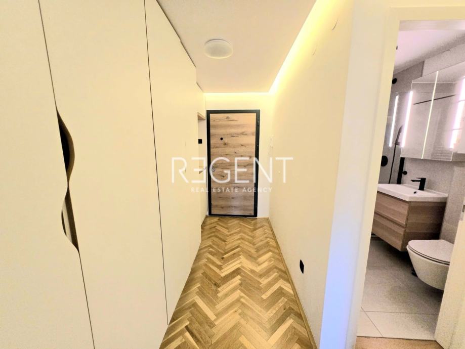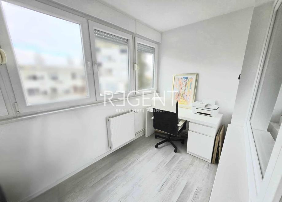 Stan se sastoji se od hodnika, dnevnog boravka s radnim kutkom, kupaonice i dodatnog wc-a, kuhinje s izbom, spavaće sobe s zatvorenom loggiom (trenutno korištenom kao ured, ali se prostor može prilagoditi prema potrebama najmoprimca).