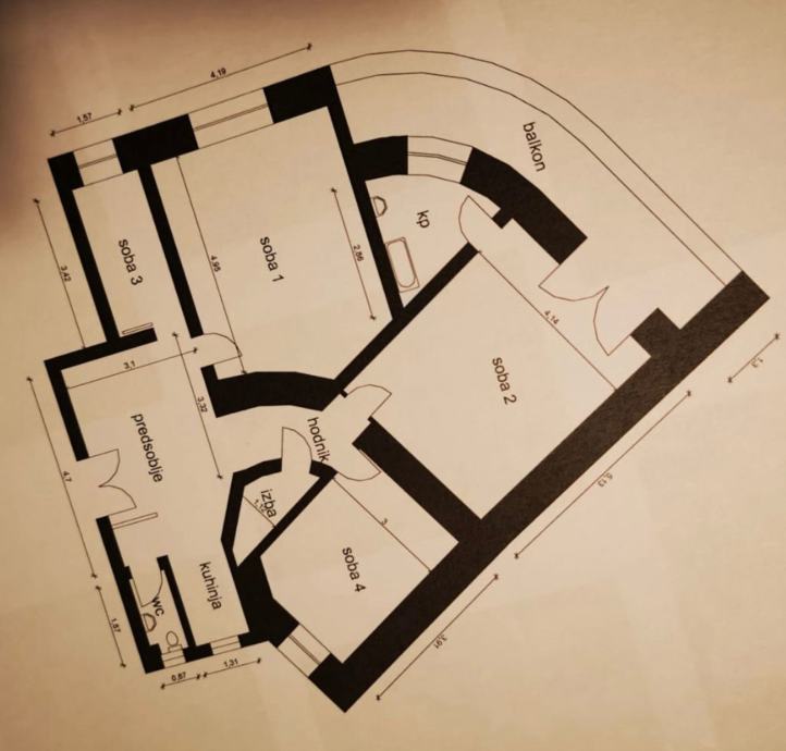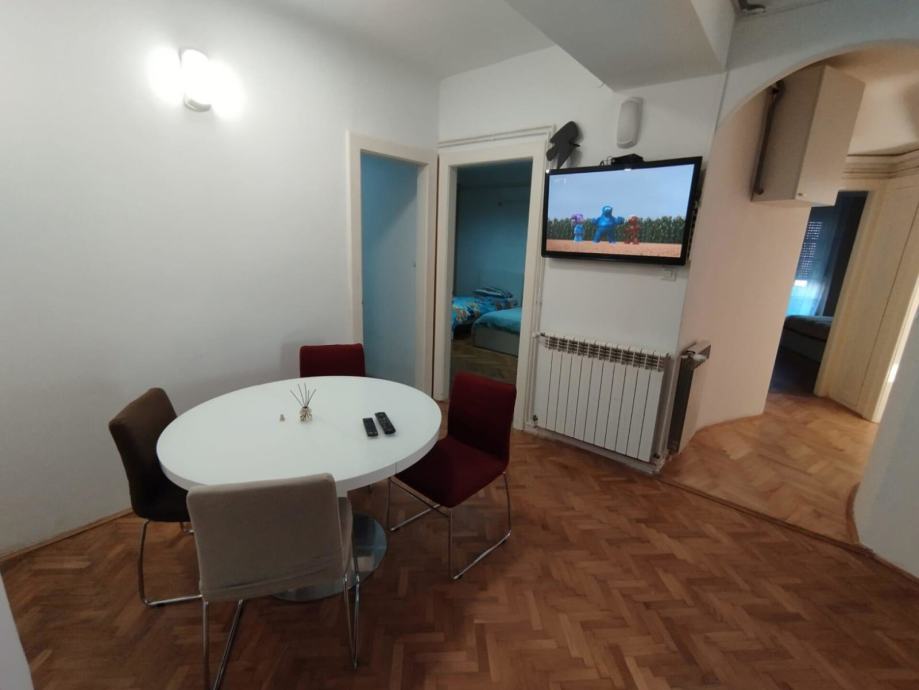 Iznajmljuje se stan površine 100m2 na drugom katu zgrade u Donjem gradu. Stan se sastoji od predsoblja, hodnika, kuhinje, blagovaone, četiri sobe, ostave, kupaonice, toaleta i balkona.