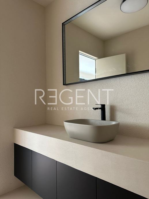 Ugrađena je troslojna ALU stolarija, podovi su izvedeni u mikrocementu (bež mat), a grijanje je riješeno električnim podnim sustavom s WiFi upravljanjem i tajmerom.