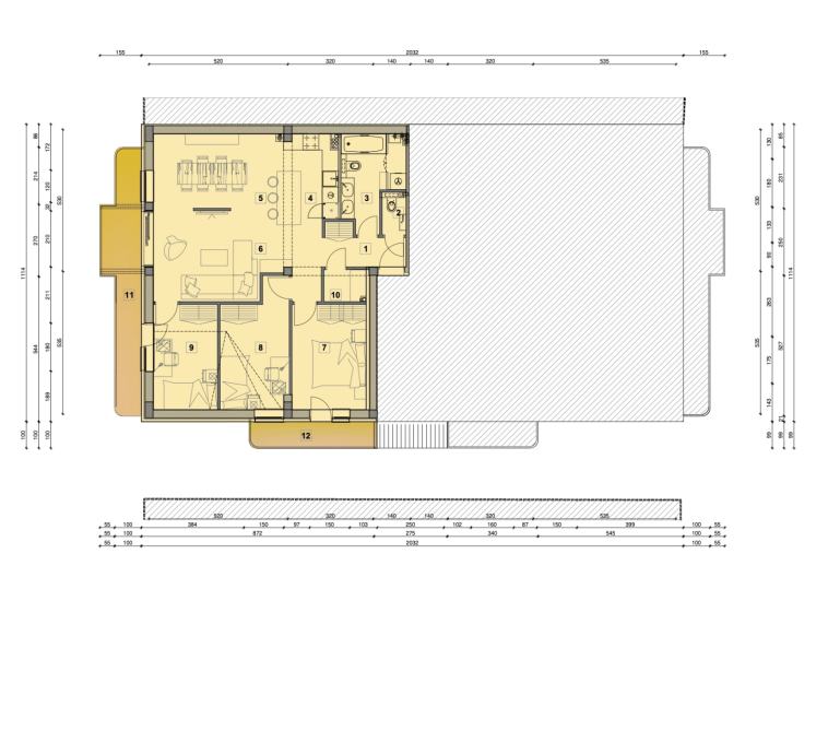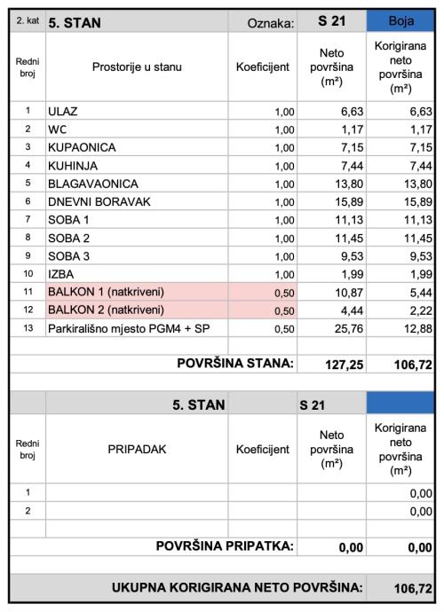 Stan se sastoji od ulaznog hodnika, velikog dnevnog boravka, kuhinje sa blagovaonicom, kupaonice, wc-a, 3 spavaće sobe, izbe, 2 natkrivena blakona/Loggie, garažnog parkirnog mjesta i spremišta.