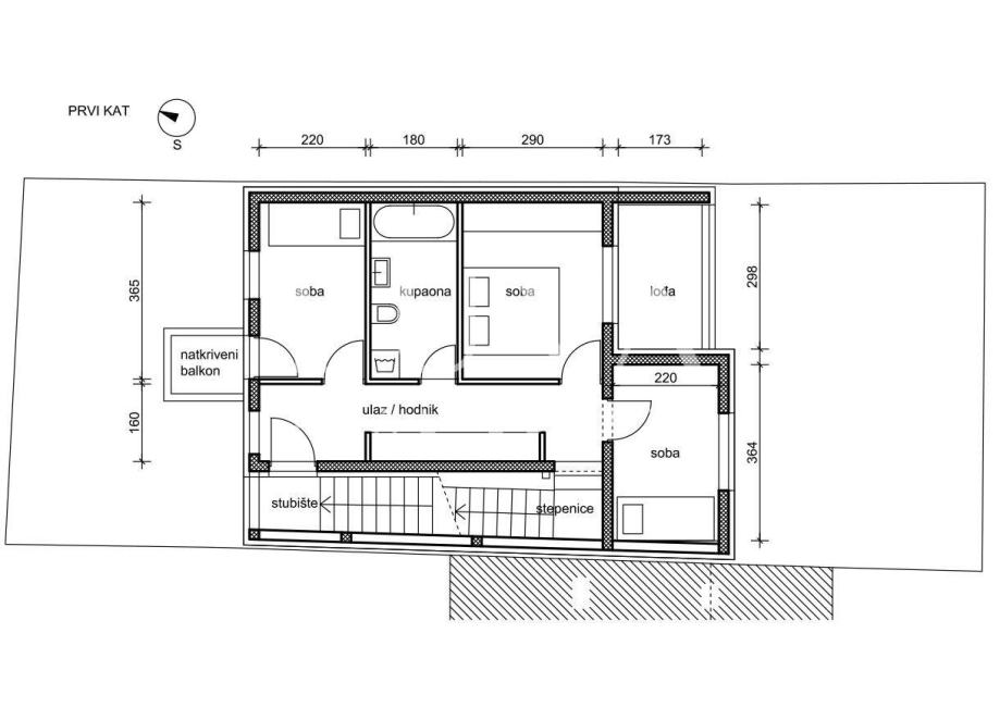Na prvoj etaži smješteni su ulazni prostor i hodnik, kupaonica, tri spavaće sobe, lođa te natkriveni balkon, idealni za miran obiteljski dio stanovanja. Unutarnje stepenice vode na gornju etažu gdje se nalazi prostrani dnevni boravak povezan s kuhinjom i blagovaonicom, dodatni WC te izlaz na nenatkrivenu terasu, savršenu za opuštanje, druženja i boravak na otvorenom.