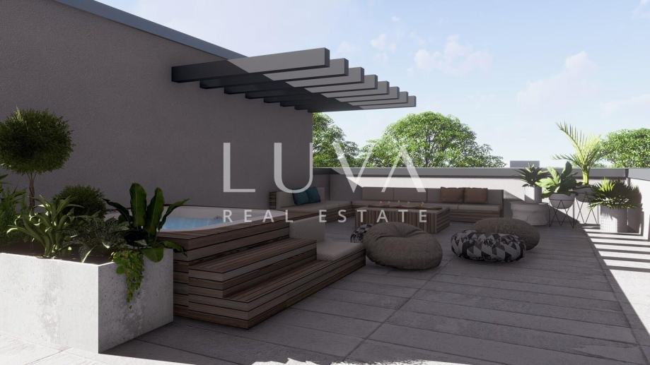 Stan se nalazi na prvom katu, a sastoji se od dnevnog boravka s kuhinjom i blagovaonicom, tri spavaće sobe, kupaonice, nenatkrivene krovne terase, balkona i ulaznog prostora.
