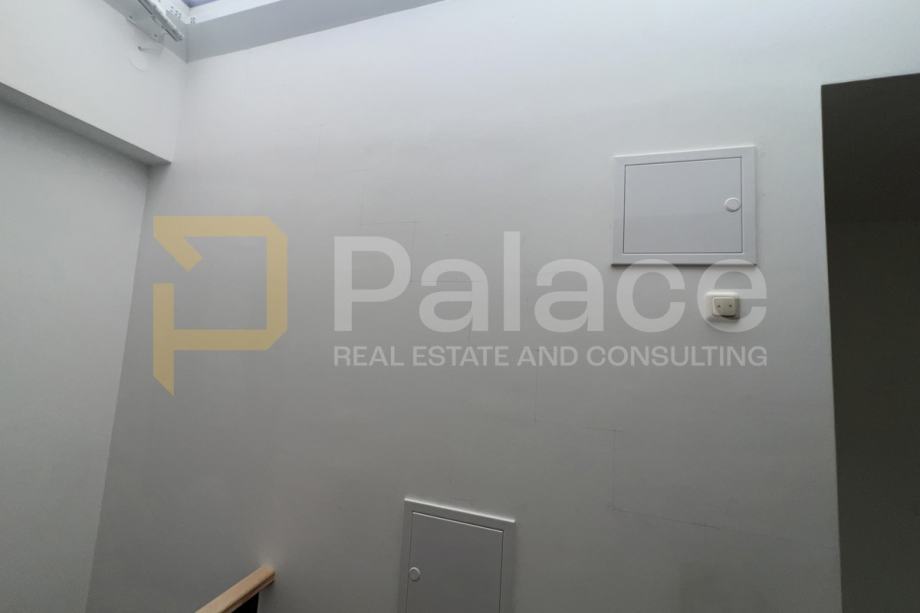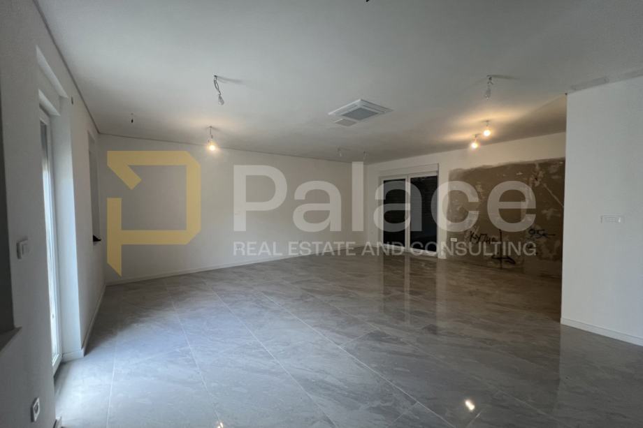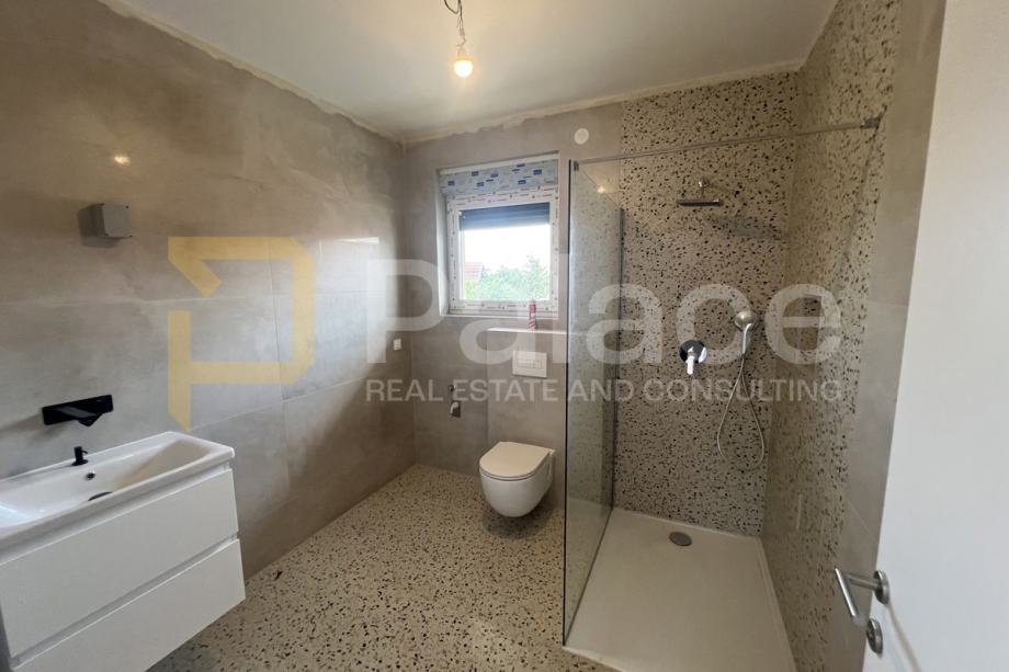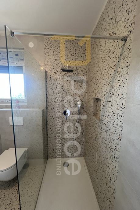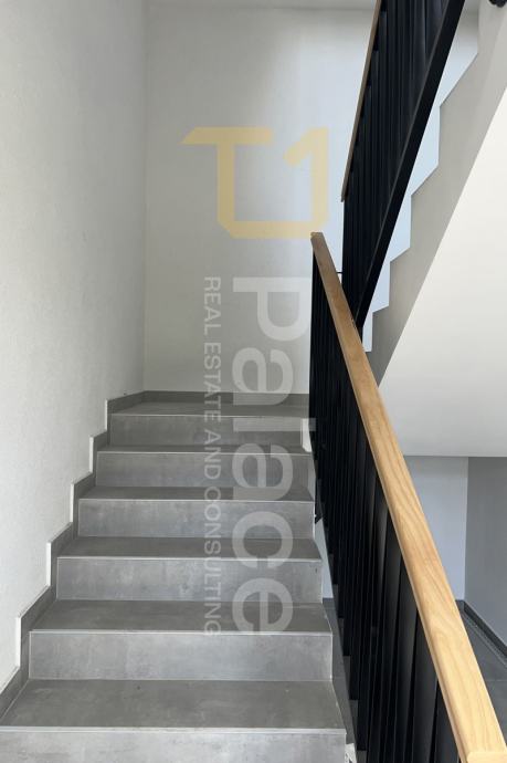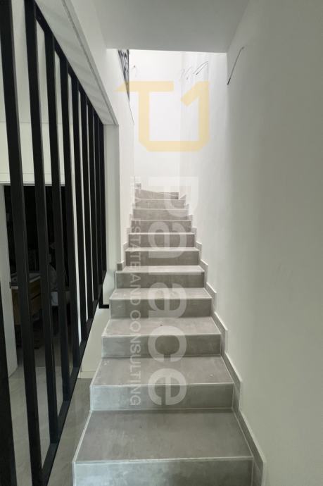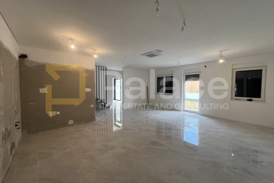Stan je ukupne površine 136 m2 . U prizemlju se nalazi veliki dnevni boravak s predsobljem, hodnikom, WC-om, kuhinjom, blagovaonom, terasom i izlaznim vratima u vrt.