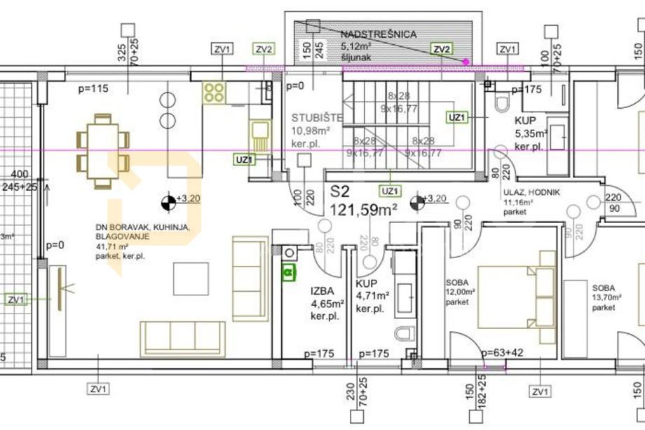 Stan je ukupne površine 122 m2 u prizemlju a sastoji se od velikog dnevnog boravaka s predsobljem, kuhinje, blagovaone, izbe, hodnika, tri spavače sobe, WC-a, kupaone s WC-om, terasom.