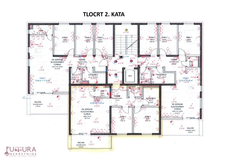 Sastoji se od: dvije spavaće sobe, dnevnog boravka + kuhinja + blagovaona, hodnika, ostave, izbe, kupaonice i balkona.