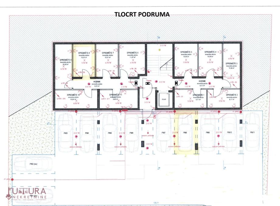 Posjeduje jedno garažno parkirno mjesto (mogućnost punione za električna vozila) i spremište od 10,01 m2.