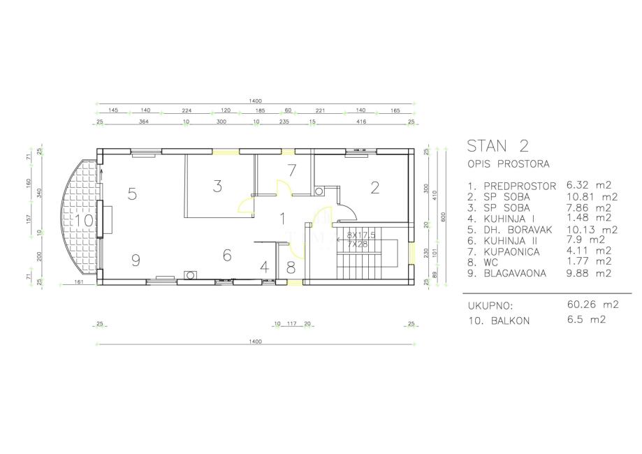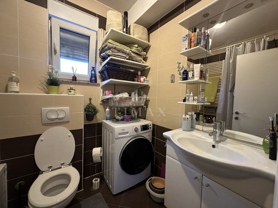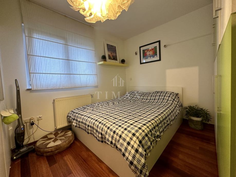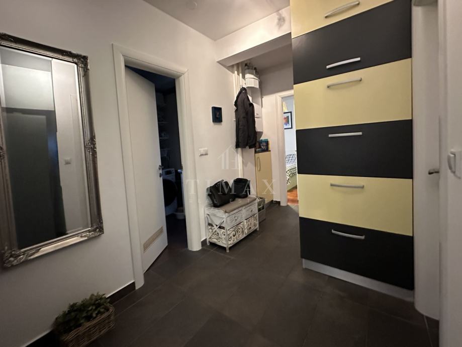Stan se sastoji od dnevnog boravka, blagovaonice, kuhinje, dvije spavaće sobe od kojih je u jednoj napravljen walk-in ormar, kupaonice, hodnika, wc-a , ostave i balkona s kojeg se pruža prekrasan pogled na grad. Stanu pripada vanjsko parkirno mjesto te garaža u podrumu.