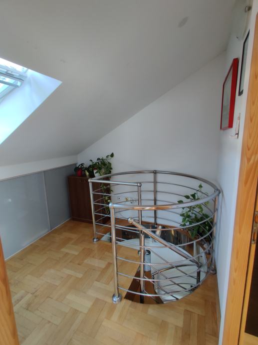 Prodajem dvoetažni trosobni (u naravi četverosobni) stan novije gradnje u visokom potkrovlju manje stambene zgrade s ukupno 6 stanova.