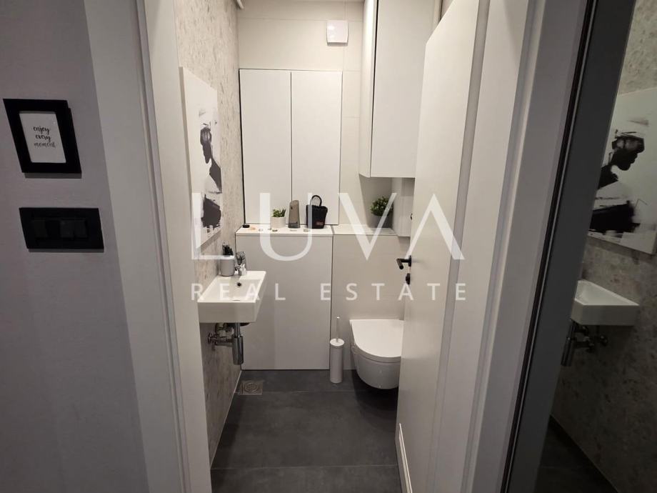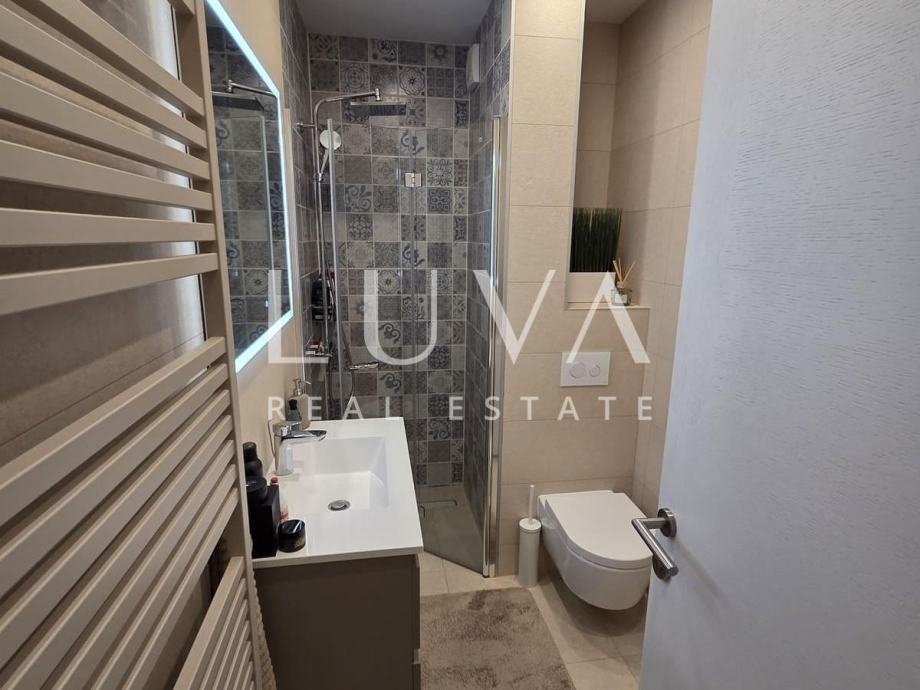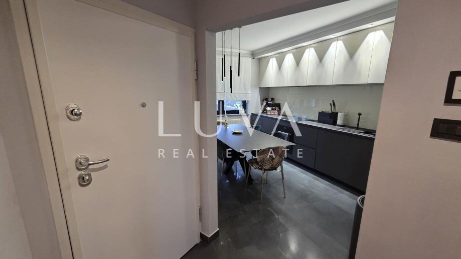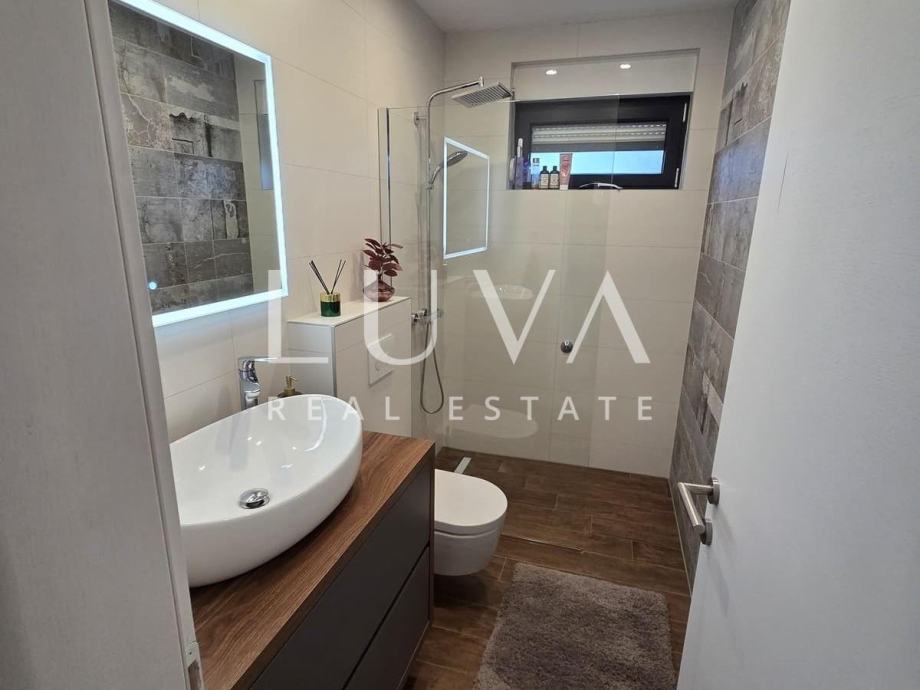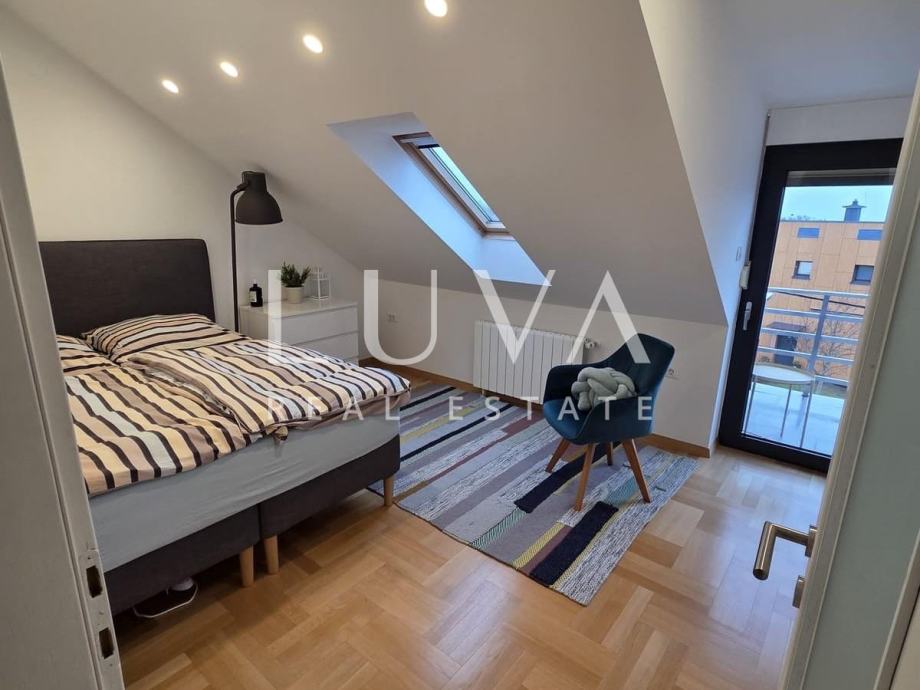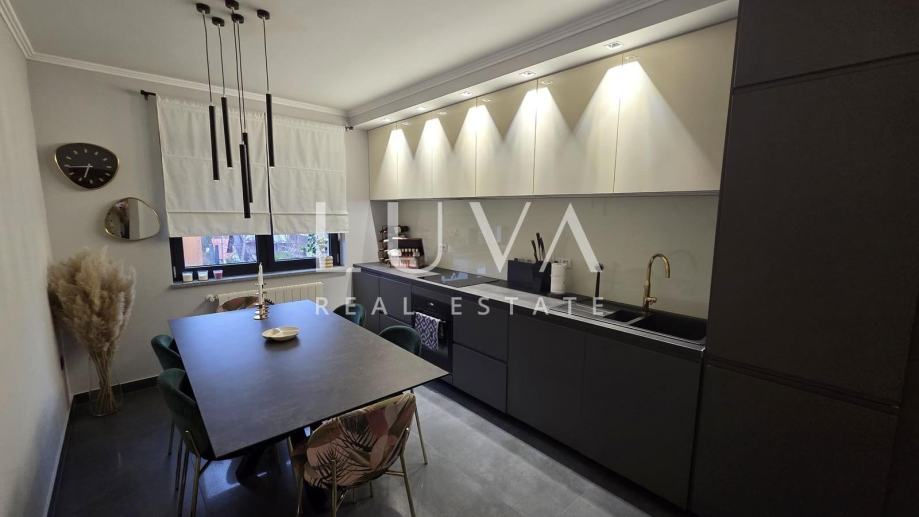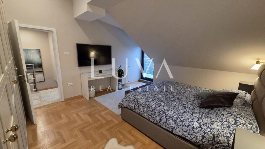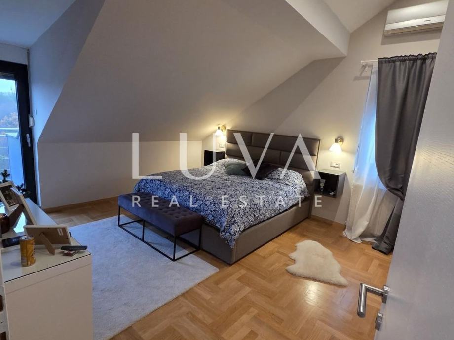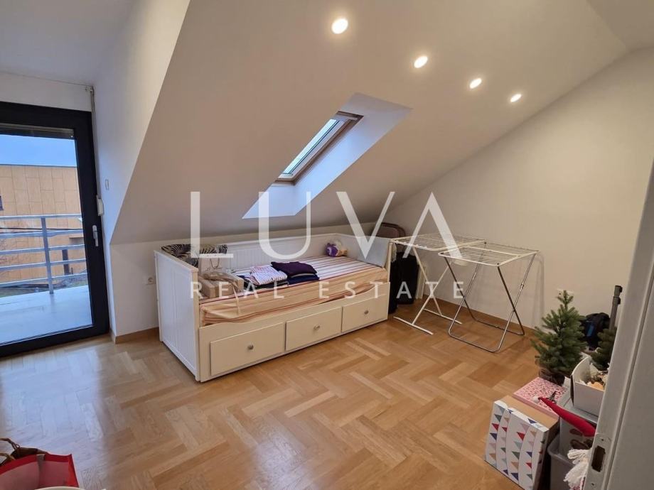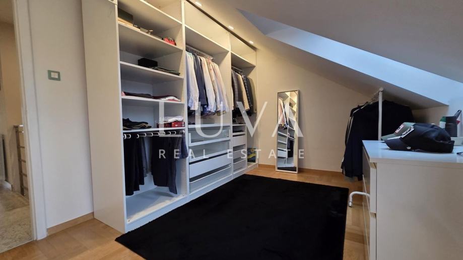 Donja etaža nudi prostrani dnevni boravak s odvojenom, potpuno opremljenom kuhinjom te gostinjskim WC-om, dok gornja etaža sadrži četiri spavaće sobe, od kojih je jedna trenutno organizirana kao walk-in ormar, dvije kupaonice te dvije prostrane terase. Stan je funkcionalno opremljen dodatnim sadržajima koji uključuju garažu i dva vanjska parkirna mjesta, a u dvorištu se nalazi sjenica površine 15 m² dostupna stanarima za opuštanje ili druženja na otvorenom.