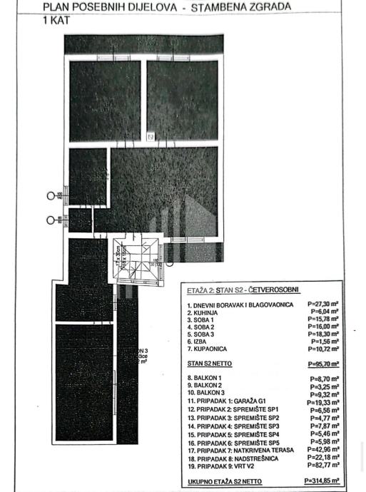 Stan se nalazi na 1. katu stambene kuće izgrađene 1984. godine, a pripadaju mu i vrt te pomoćne zgrade u dvorištu, sveukupne netto površine 314,85 m2.
