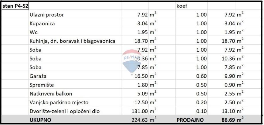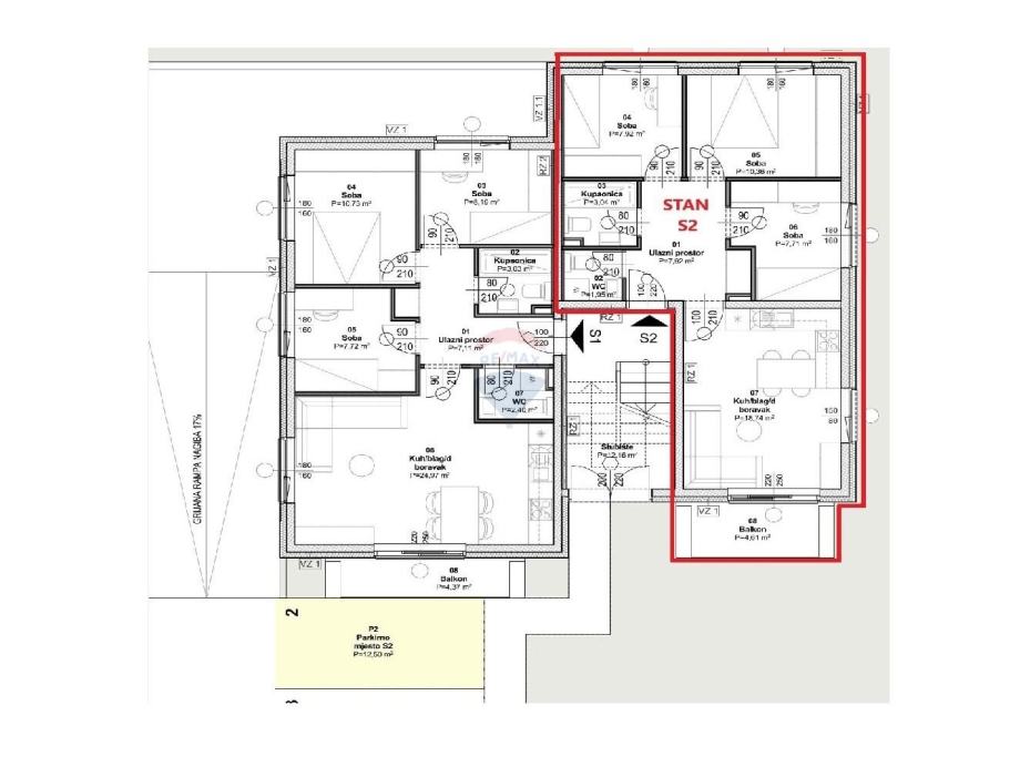 Stan P4-S2 nalazi se u prizemlju a sastoji se od tri spavaće sobe, dnevnog boravka s kuhinjom, kupaonice, dodatnog toaleta, hodnika i balkona, sveukupno neto stambenog prostora 60 m2.