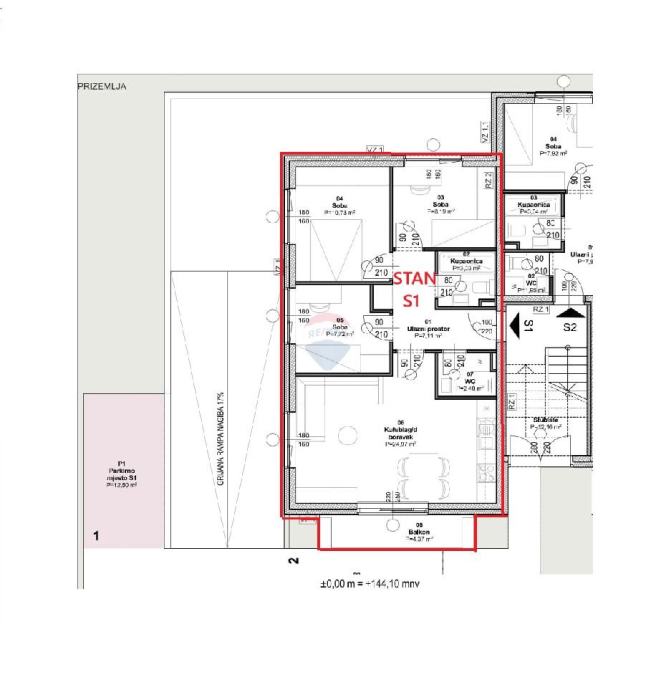 Stan S1 nalazi se u prizemlju a sastoji se od tri spavaće sobe, dnevnog boravka s kuhinjom, kupaonice, dodatnog toaleta, hodnika i balkona, sveukupno neto stambenog prostora 66 m2.