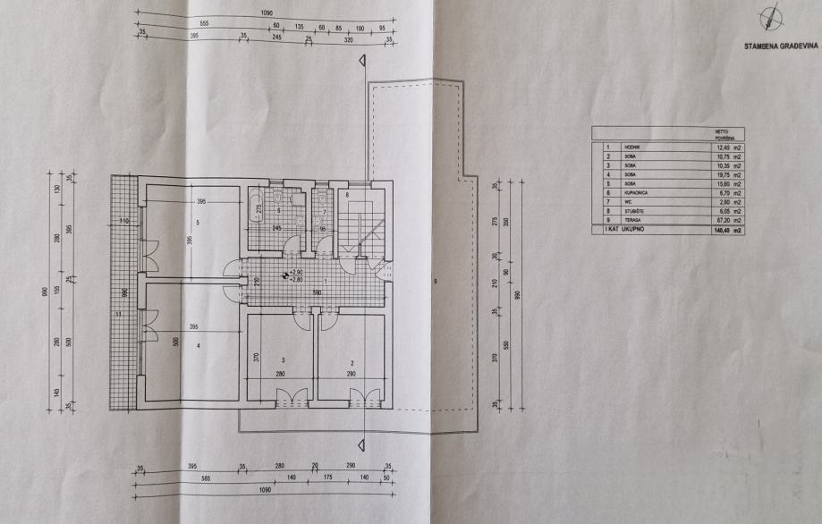 Unutarnje stepenice vode na 1. kat koji se sastoji od 4 sobe, kupaonice i odvojenog WC-a. Sve sobe imaju izlaz na balkon i veliku terasu, a u jednoj sobi su instalacije vode i odvodnje te je moguće smjestiti još jednu kuhinju. Veličina 1. kata je 140 m2, u što je uključena i terasa od 67 m2.