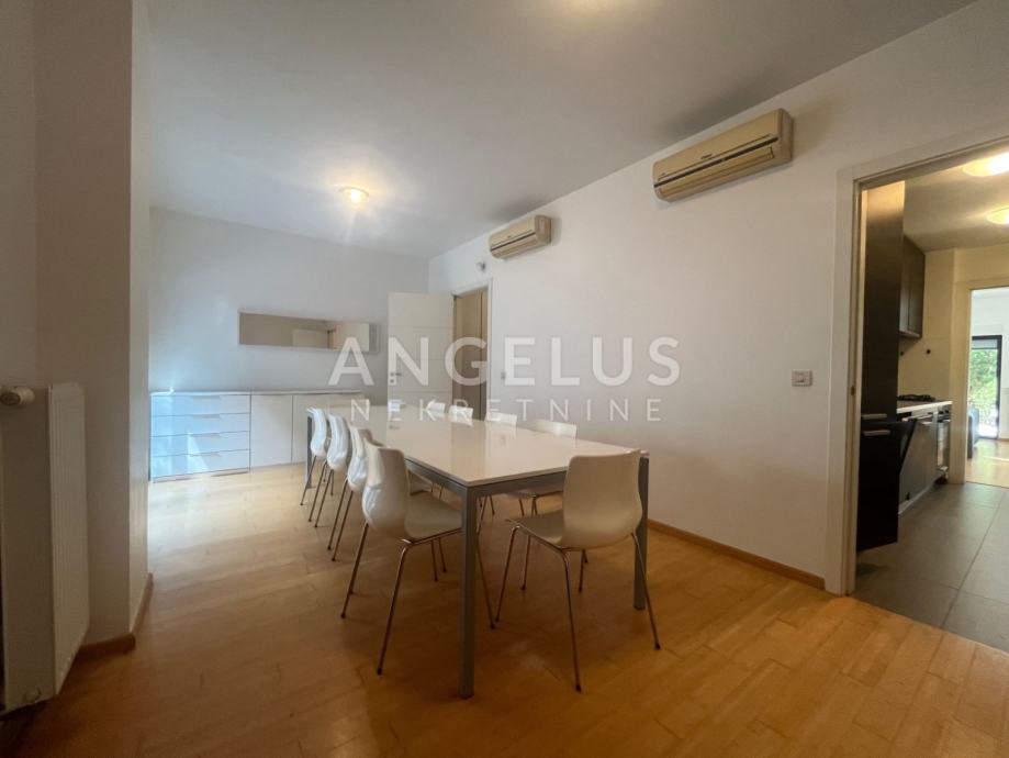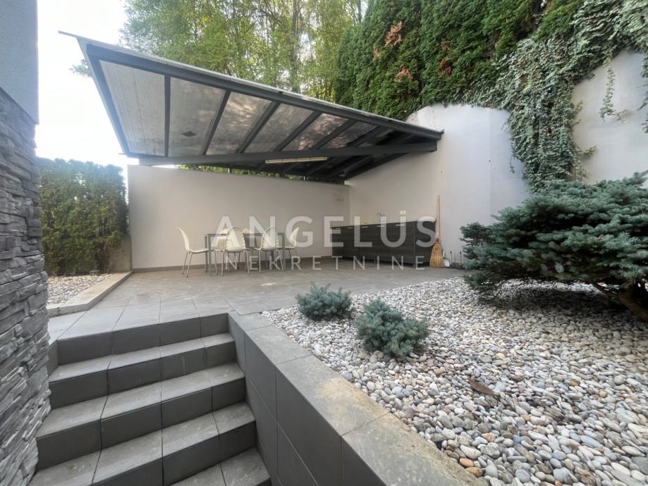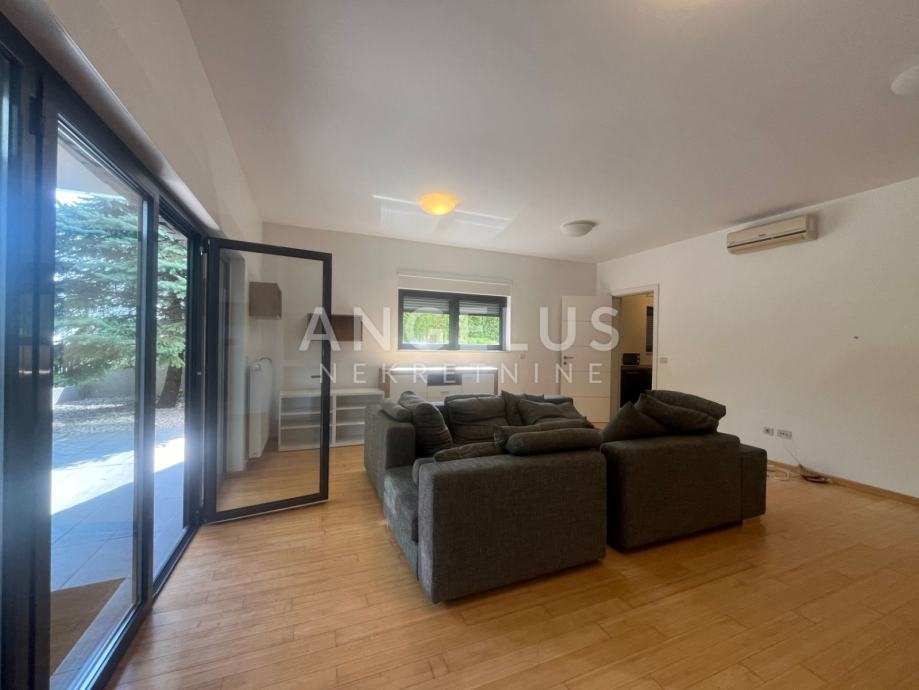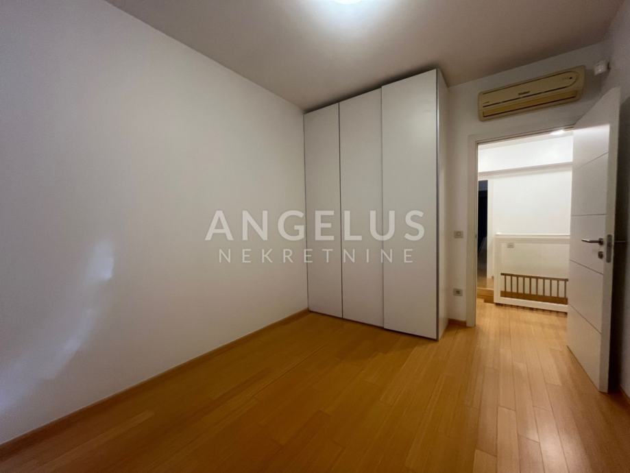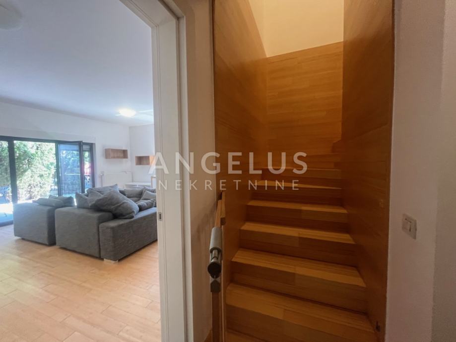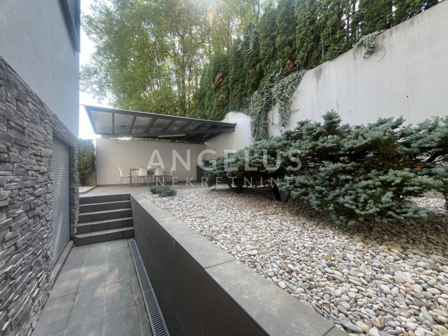 Prva etaža (prizemlje) sastoji se od: ulaznog hodnika, kupaonice, ostave, kuhinje, dnevnog boravka i blagovaonicom i izlazom na terasu i vrt, a druga (1.kat) od: 4 spavaće sobe, balkona i dvije kupaonice. Klimatiziran je, plinsko centralno grijanje. Nenamješten je (osim kuhinje i ugradbenih ormara), namještaj po dogovoru. Pripadaju mu spremište (12 m2) i 2 parkirna mjesta. U vrtu (cca. 200 m2) nalazi se ljetna kuhinja i roštilj.