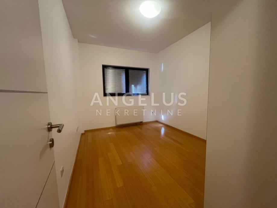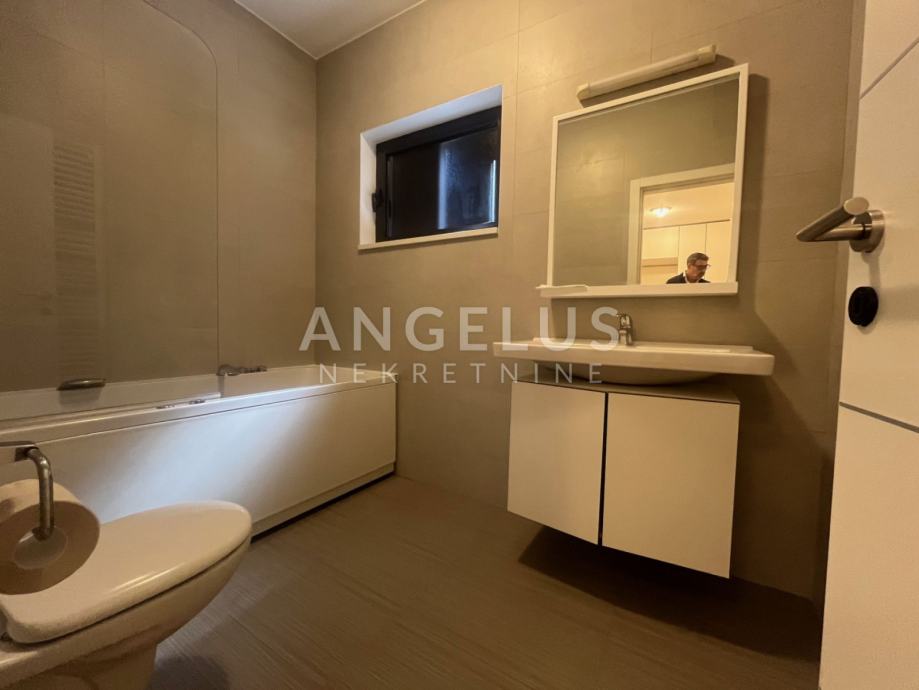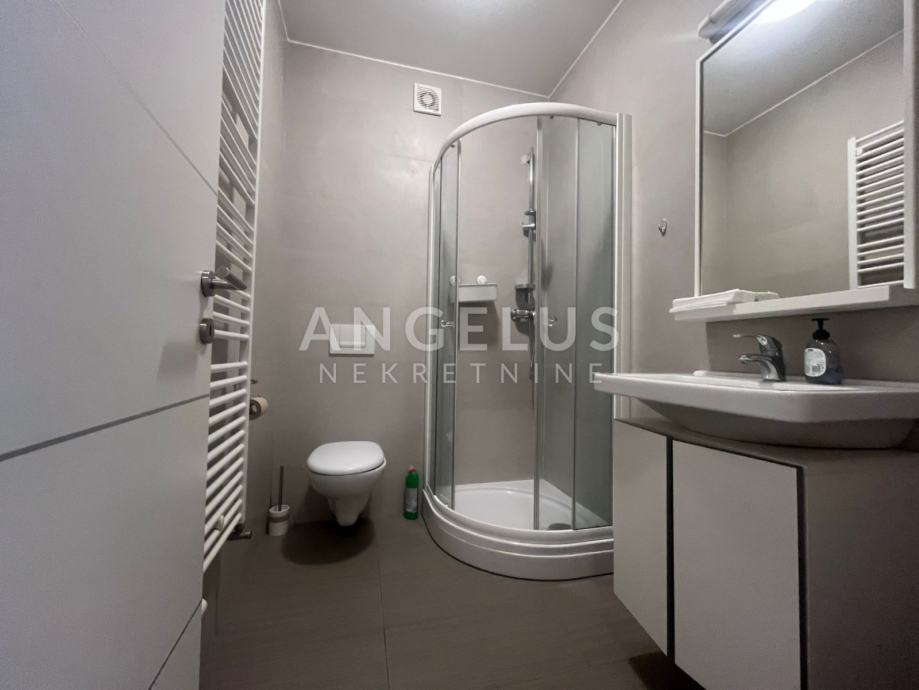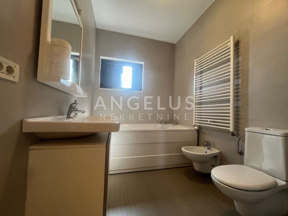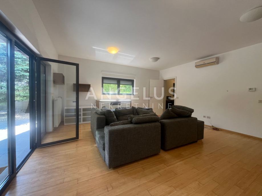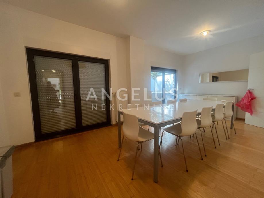 Prva etaža (prizemlje) sastoji se od: ulaznog hodnika, kupaonice, ostave, kuhinje, dnevnog boravka i blagovaonicom i izlazom na terasu i vrt, a druga (1.kat) od: 4 spavaće sobe, balkona i dvije kupaonice. Klimatiziran je, plinsko centralno grijanje. Nenamješten je (osim kuhinje i ugradbenih ormara), namještaj po dogovoru. Pripadaju mu spremište (12 m2) i 2 parkirna mjesta. U vrtu (cca. 200 m2) nalazi se ljetna kuhinja i roštilj.