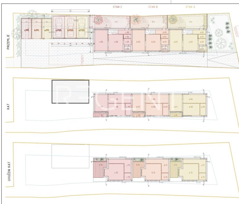 Na mirnoj i zelenoj lokaciji Gornjeg Bukovca prodaje se moderna kuća u nizu (crvena na slici), bruto površine 184,07 m², raspoređena na tri etaže. Kuća ima vlastiti vrt, terasu, spremište, loggiu, garažno i vanjsko parkirno mjesto. Završetak gradnje očekuje se u rujnu 2025.Raspored prostorija:Prizemlje: ulazni hodnik (2,70 m²), dnevni boravak (14,40 m²), kuhinja i blagovaonica (16,07 m²), WC (2,70 m²), spremište (1,60 m²), vrt (3,23 m² obračunski).Kat: stubište i hodnik (11,59 m²), dječja soba 1 (13,07 m²), dječja soba 2 (12,01 m²), kupaonica (3,90 m²), loggia (3,00 m² obračunski).Uvučeni kat: stubište i hodnik (9,51 m²), spavaća soba (17,00 m²), kupaonica (2,71 m²), terasa (8,16 m² obračunski).Oprema i izvedba:Nekretnina je građena prema visokim standardima energetske učinkovitosti, s modernom aluminijskom stolarijom, višeslojnim parketima i pripremom za podno grijanje i klimatizaciju.Garažno mjesto u zajedničkoj garaži (7,77 m² obračunski) i vanjsko parkirno mjesto (2,50 m² obračunski).Lokacija:Kuća se nalazi na atraktivnoj, ali tihoj lokaciji idealnoj za obiteljski život, u neposrednoj blizini škola, vrtića, trgovina i javnog prijevoza.Za više informacija ili dogovor o razgledavanju, slobodno nas kontaktirajte.Za više informacija, kontaktirajte našeg agenta na brojeve telefona:
