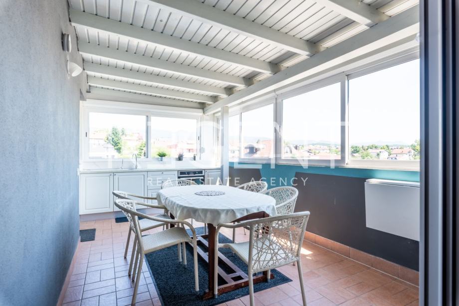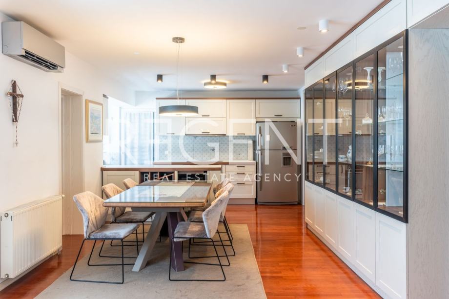 U mirnoj ulici Kostanjevec, u zelenilu Gornjeg Bukovca, iznajmljuje se prostran peterosoban stan smješten na drugom katu moderne urbane vile s ukupno pet stanova. Stan se nalazi u jednoj od najpoželjnijih rezidencijalnih zona Maksimira, savršenoj za obiteljski život s obiljem prirode i blizinom svih bitnih sadržaja.Stan zauzima ukupnu površinu od 157 m², od čega je 126,62 m² zatvorenog stambenog prostora. Tlocrt je izuzetno funkcionalan i uključuje ulazni hodnik, prostrani dnevni boravak povezan s blagovaonicom i potpuno opremljenom kuhinjom, zimski vrt s dodatnom kuhinjom, roditeljsku spavaću sobu s privatnom kupaonicom i izlazom na balkon, tri dječje sobe, radnu/gostinjsku sobu, glavnu kupaonicu te ostavu.Stan je u potpunosti renoviran 2016. godine s pažljivo biranim materijalima, a opremljen je etažnim plinskim grijanjem, klima uređajima, protuprovalnim vratima, PVC stolarijom, parketom, portafonom, kuhinjskim otokom, satelitskom TV i optičkim internetom.Nekretnini pripada i dodatni prostor: spremište površine 14,65 m², garaža od 10,72 m² te dva vanjska parkirna mjesta po 12,50 m².Lokacija omogućuje udoban život u blizini škole, vrtića, trgovina, autobusnih linija i parkova. Naselje Kostanjevec posebno je cijenjeno zbog svoje mirne, sigurne i obiteljske atmosfere, a istovremeno pruža odličnu povezanost s gradskim središtem.Režije su odprilike 250 euraZa više informacija ili dogovor o razgledavanju, slobodno nas kontaktirajte.Za više informacija, kontaktirajte našeg agenta na brojeve telefona:
