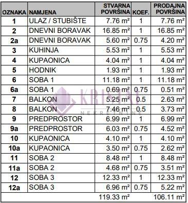 4-SOBAN stan u potkrovlju površine 106.11 m2. Sastoji se od ulaznog prostora sa stubištem, kuhinje, dnevnog boravka, tri spavaće sobe, hodnika, predprostora, dvije kupaonice i balkona. Stvarna površina s otvorenim i zatvorenim prostorima iznosi 119.33 m2.