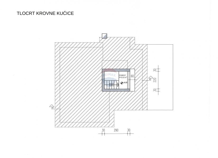 Prizemlje: Prostrana dnevna soba iz koje se ide u radnu sobu te na veliku terasu s pogledom na okolinu. Par stepenica vode u kuhinju koja ima izlaz na stražnju, sjevernu terasu koja je idealna