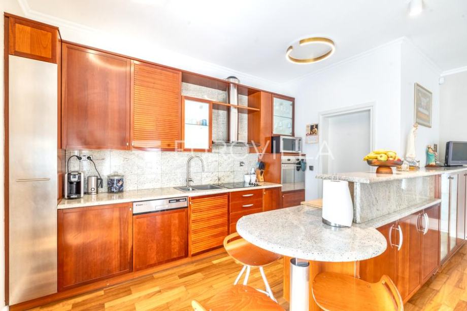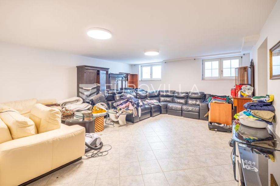 Atraktivna kuća površine 440 m2, na više etaža, s pripadajućom okućnicom, bazenom i natkrivenim parkingom.Na glavnoj etaži nalazi se prostrani ulazni prostor, gostinjski toalet, jedna spavaća soba s vlastitom kupaonicom, dnevni boravak s kaminom, blagovaonica i kuhinja. Iz dnevnog dijela...
