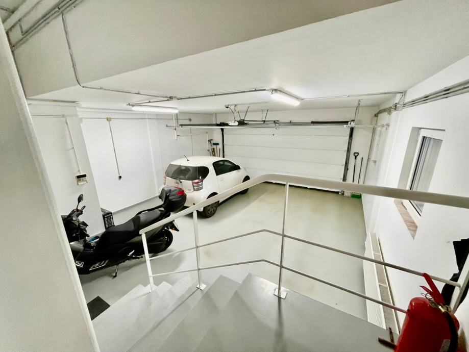Prva etaža: sastoji se od prostrane garaže za dva automobila s direktnom ulazom u teretanu/radnu sobu, vešeraj i kotlovnicu (tehnička soba) i ostavu.