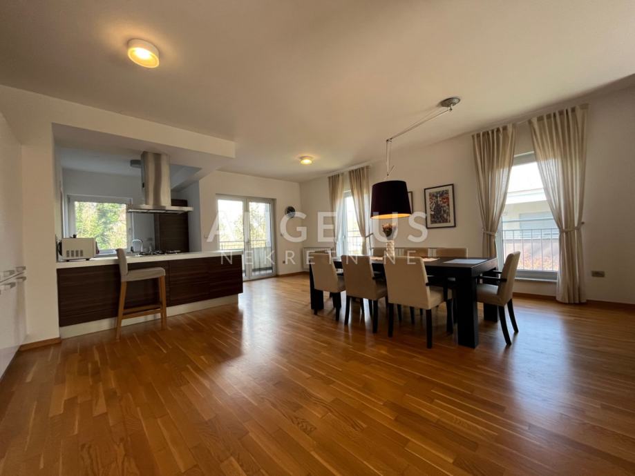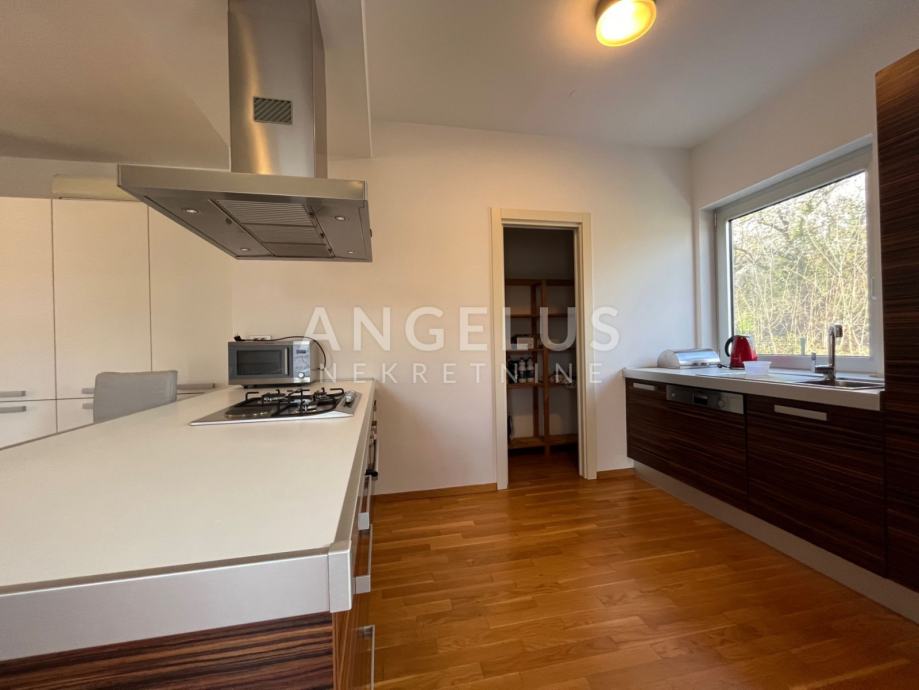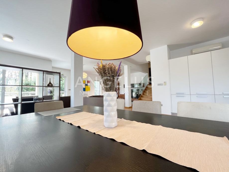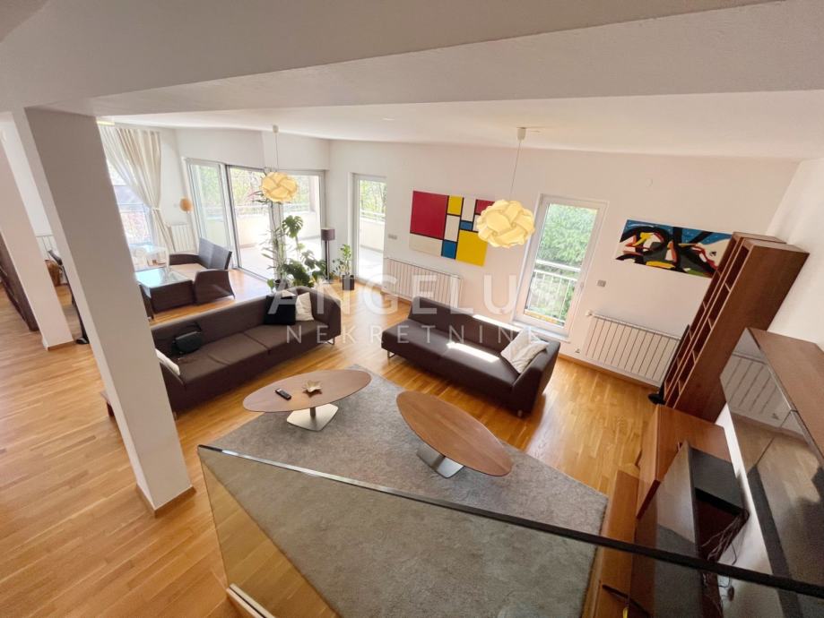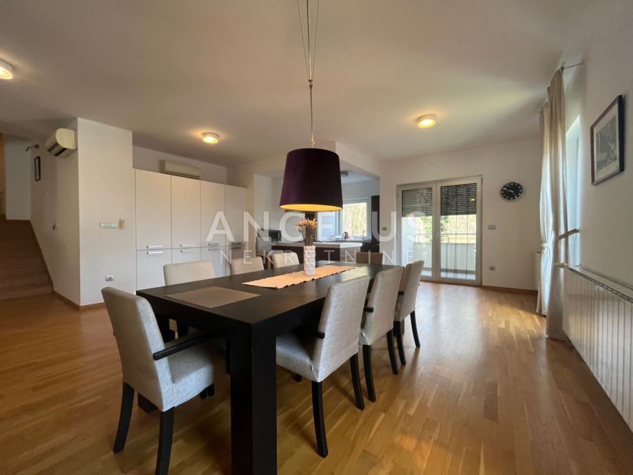 Prostire se na 2 etaže, na prvoj je velika kuhinja, blagovaonica, smočnica i terasa. Na katu su 3 spavaće sobe (glavna ima garderobu i svoju kupaonicu), dodatna kupaonica i toalet. Pripadaju mu 2 garažna mjesta, spremište u podrumu i parkirno mjesto u dvorištu. Može biti namješten i nenamješten.
