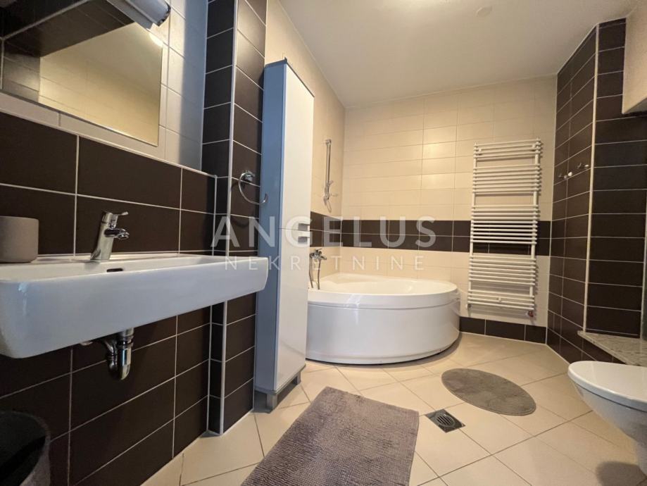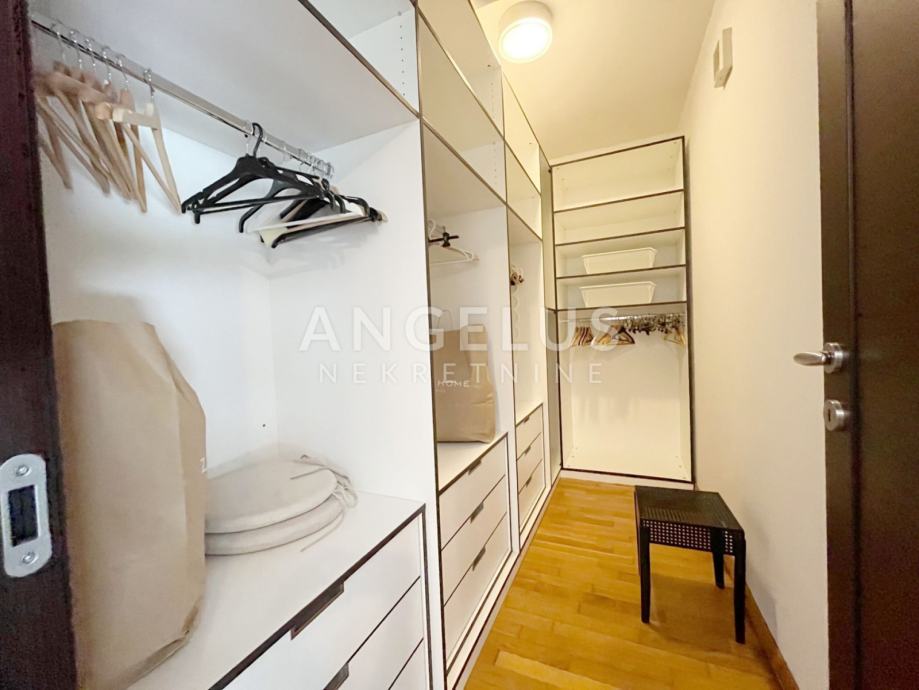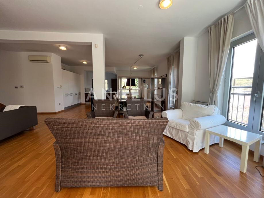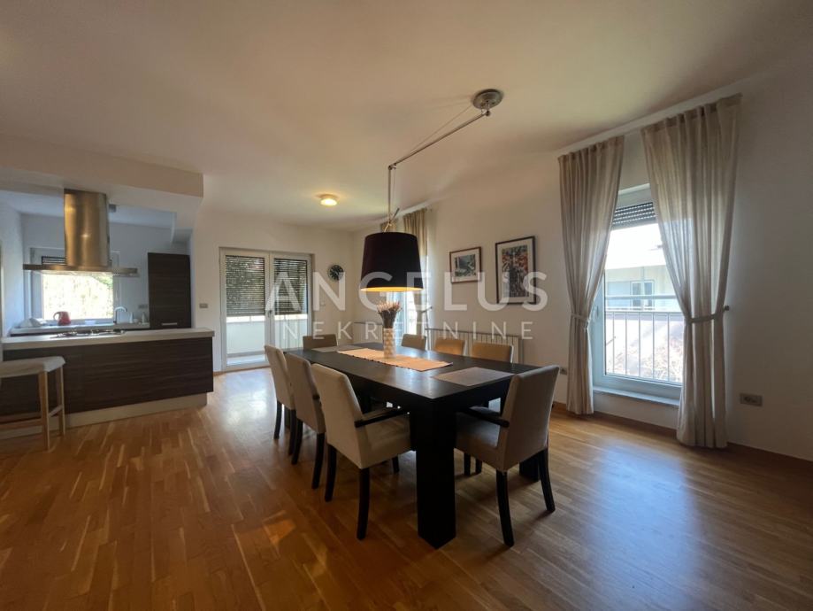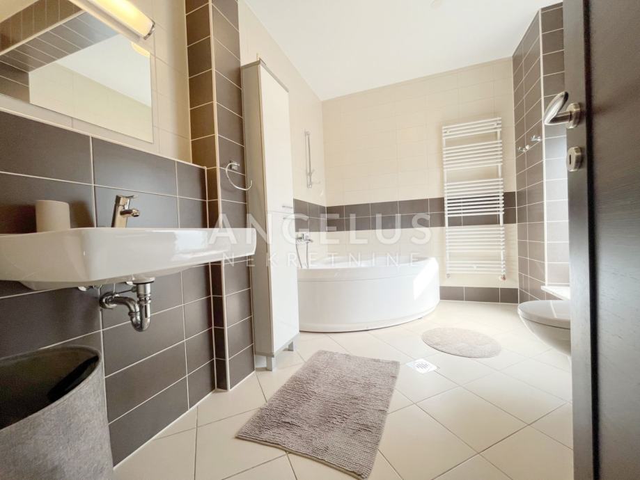 Prostire se na 2 etaže, na prvoj je velika kuhinja, blagovaonica, smočnica i terasa. Na katu su 3 spavaće sobe (glavna ima garderobu i svoju kupaonicu), dodatna kupaonica i toalet. Pripadaju mu 2 garažna mjesta, spremište u podrumu i parkirno mjesto u dvorištu. Može biti namješten i nenamješten.