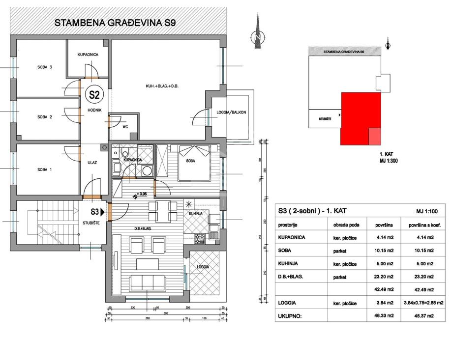Stan oznake S9-S3, dvosoban, nalazi se na 1. katu te se sastoji od: dnevnog boravka sa kuhinjom i blagovaonicom (28,20m2), kupaonice (4,14m2), sobe (10,15m2), ukupne stambene površine 42,49m2, te lođe od 3,84m2 (obračunski 2,88m2) i vanjskog parkirnog mjesta od 12,5m2 (obračunski 3,13m2). Ukupna prodajna površina je 48,50m2.