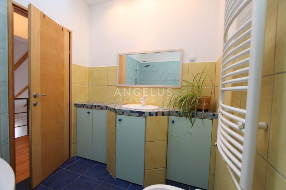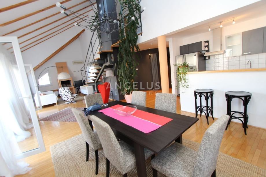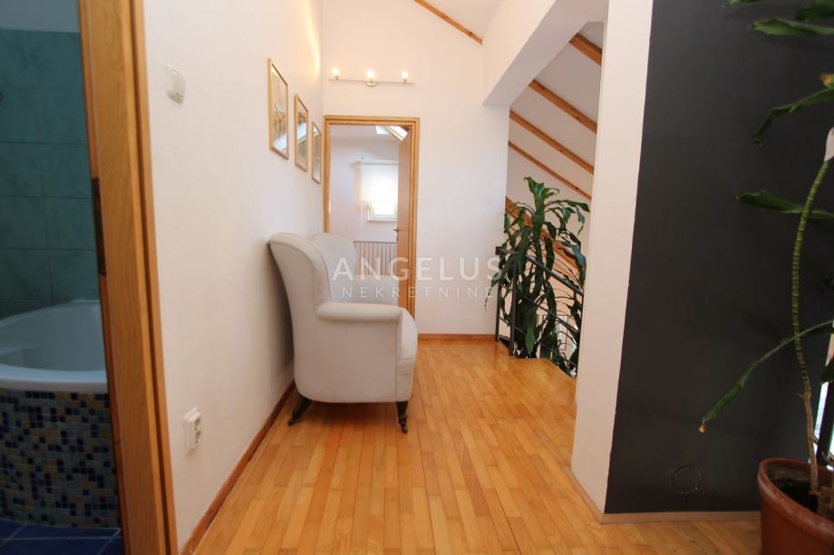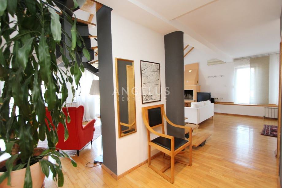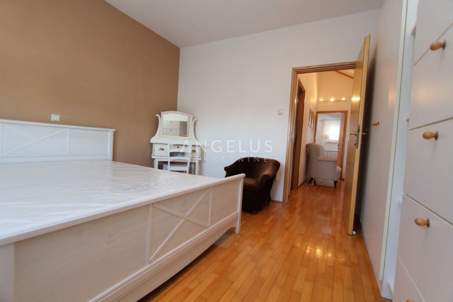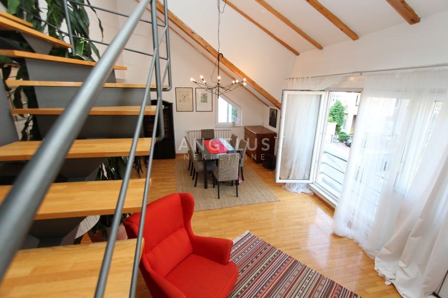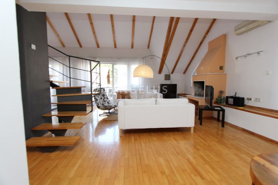 Nalazi se na 2. katu manje zgrade bez lifta, a prostire se na 2 etaže. Na donjoj se nalazi kuhinja povezana sa blagovaonicom i prostranim dnevnim boravkom sa kaminom, ostava, toalet i praonica. Na gornjoj etaži su dvije spavaće sobe i 2 kupaonice. Namješten je, klimatiziran i ima parkirno mjesto u dvorištu.