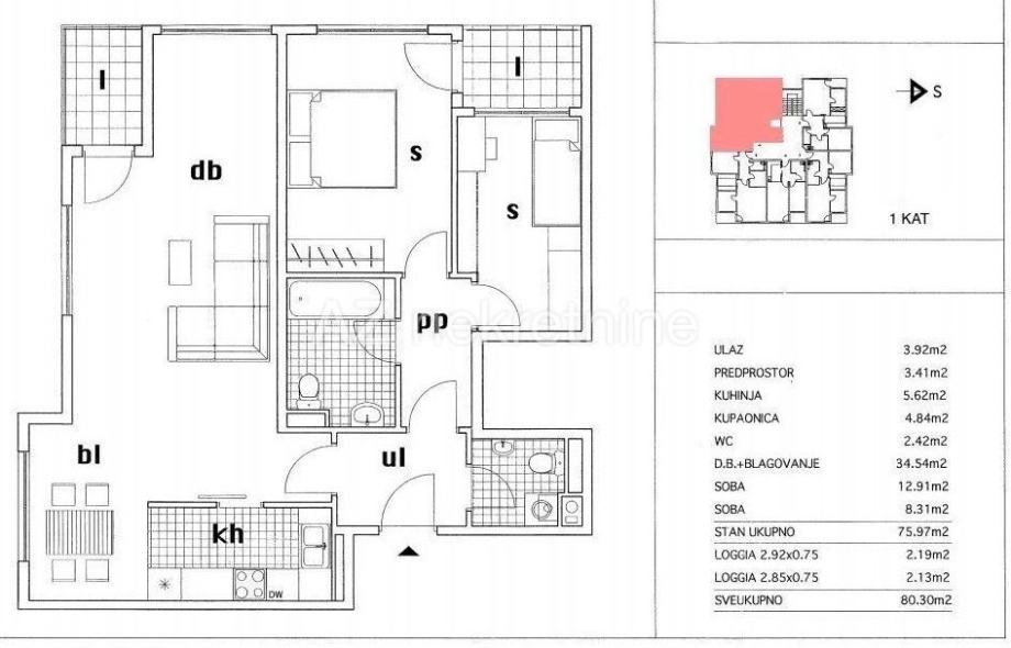 Stan se sastoji od ulaznog hodnika, prostrane dnevne sobe sa izlazom na lođu, dvije spavaće sobe, kuhinje sa blagovaonicom i wc-a.