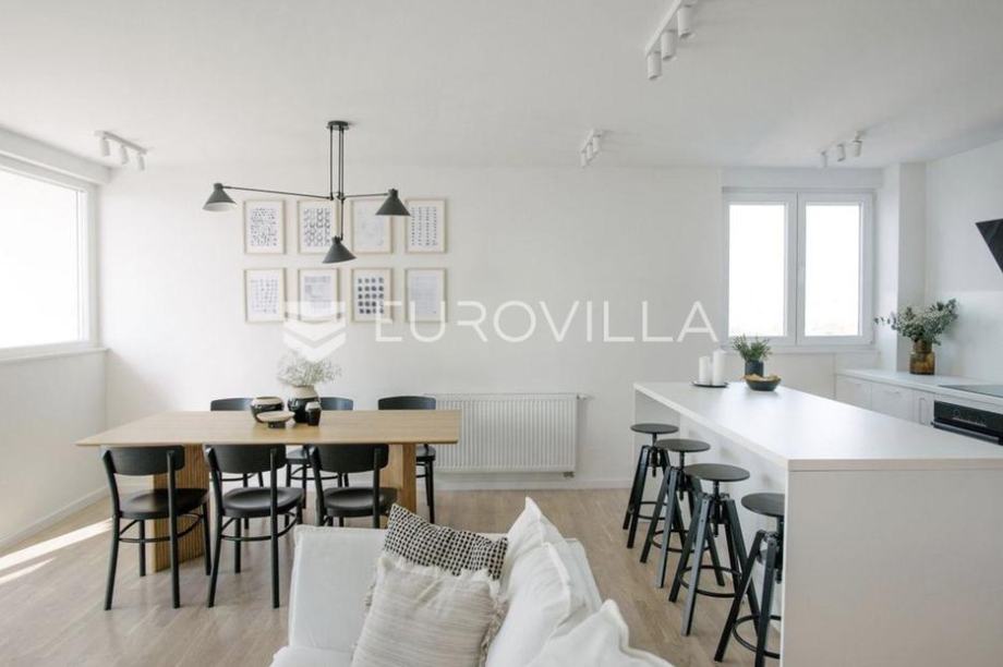 Zagreb, Kvatrić, luxurious four-bedroom apartment, 93 m2 on the 11th floor of a well-maintained building.It consists of an entrance hall, a spacious living room with a kitchen, a dining room and access to a balcony, three bedrooms, two bathrooms and a storage room.The apartment is completely...