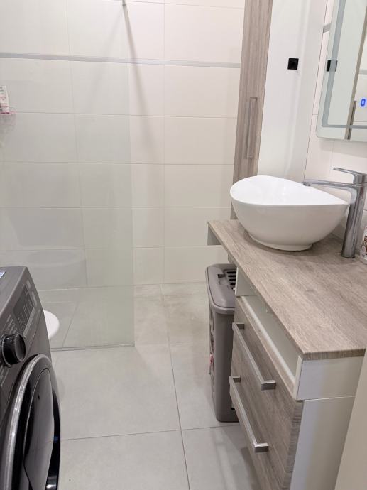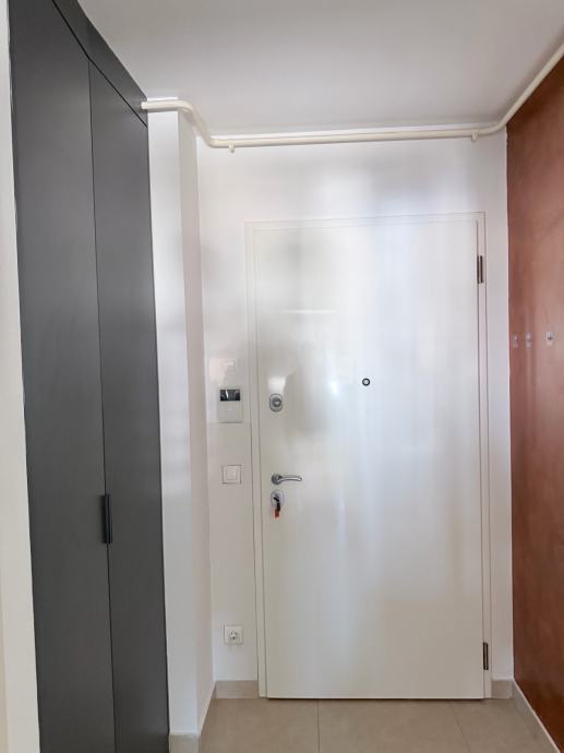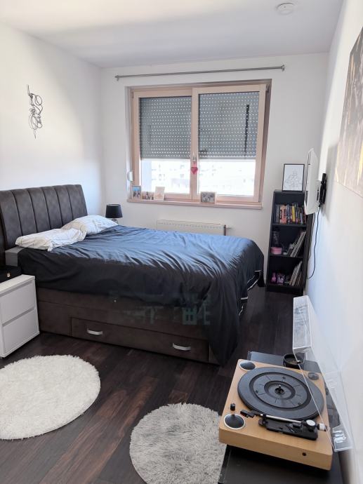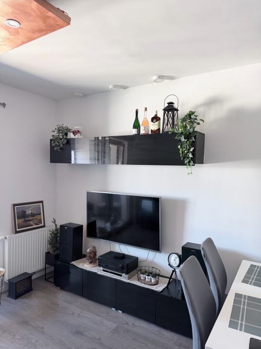 Raspored stana obuhvaća dnevni boravak spojen s blagovaonicom i kuhinjom, dvije spavaće sobe sa walk in ormarom te kupaonicu s WC-om. Uz stan se nalazi lođa. Stan dolazi potpuno stilski preuređen i namješten - dnevna soba uređena je s kaučem, TV jedinicom i blagovaonskim stolom, a kuhinja je siva, modernog dizajna s ugradbenim elementima. Klimatizacija je instalirana, a zgrada ima video portafon.